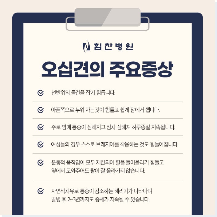 이후 동결기에는 어깨 경직이 심해지는 시기로 관절 움직임에 제한이 생겼습니다. 3단계 해리기로는 통증이 감소하고 경직도도 좋아지는데 12~42개월 정도 걸리므로 현재 증상이 심한 1, 2단계라면 병원에서 본인 상태에 따른 오십견 치료 방법을 안내받는 것이 좋습니다. 대표적인 증상으로는 높이의 물건을 잡기 어렵거나 밤에 통증이 심해져 잠이 잘 오지 않고 자주 깨는 경우가 있었습니다. 여성분이라면 혼자 속옷을 착용하기 어려워질 수 있고, 혼자 팔을 들어올리기 힘들다면 오십견을 의심해봐야 했습니다.
