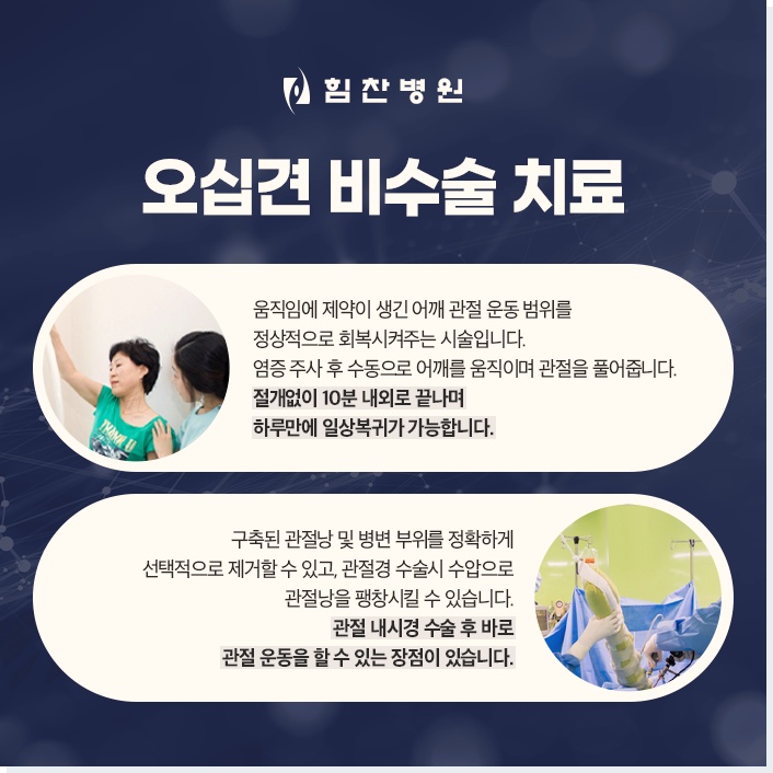 하지만 보존적인 진행만으로도 눈에 띄는 변화가 일어나지 않았다면 관절경 수술을 통해 수압으로 관절낭을 팽창시키는 방법을 적용할 수 있었습니다. 수술이라고 해도 바로 관절 운동을 시도할 수 있을 정도의 것을 기대할 수 있었습니다. 오십견이라면 편안하게 팔을 움직일 수 있을 때까지 어느 정도의 기간이 필요하다는 것을 기억하셔야 했습니다.