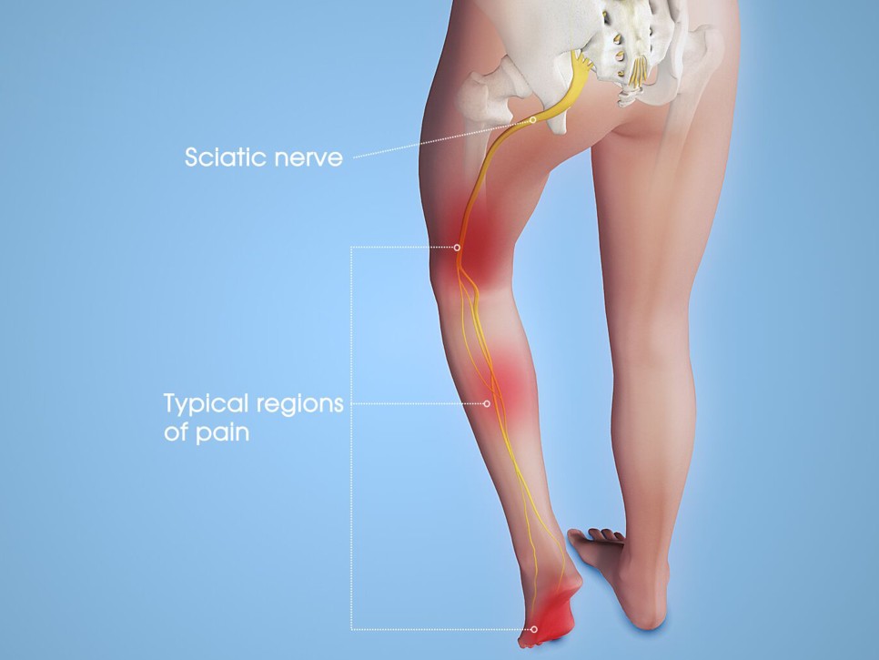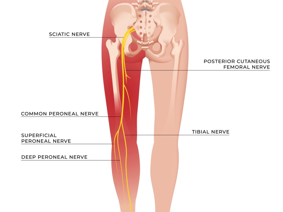 좌골을 지나 다리로 이어지는 좌골신경은 엉덩이 및 허벅지 바깥쪽에서 시작하여 종아리 바깥쪽/뒤로 띠 모양으로 이어지는 통증이 일반적입니다.