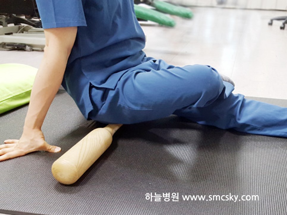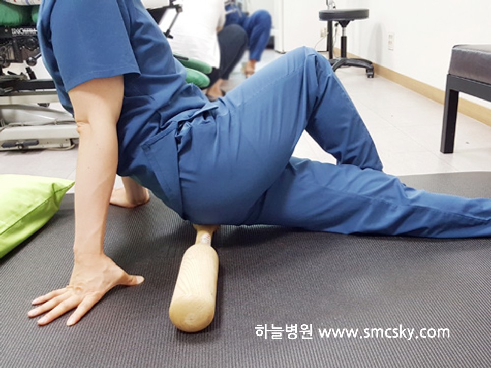 - 한쪽 다리는 뻗고 반대쪽 다리의 무릎은 구부려 한쪽 다리 위로 교차합니다.- 양팔은 뒤로 하고 받쳐줍니다.- 골반뼈 하단에 막대, 절구를 위치시킵니다. 위치는 대개 상단 뼈 사진의 파란색 부분입니다.- 10초 정도 살짝 눌러줍니다. 세밀하게 움직이고 시간이나 강도를 자신에게 맞게 조절합니다.