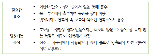 ① 광합성이 일어나는 장소 : 엽록체 ② 광합성에 필요한 요소와 생성되는 물질
