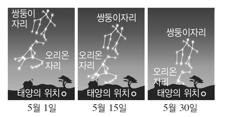(3) 계절별 별자리 변화: 지구가 회전하고 태양이 보이는 위치가 바뀜에 따라 지구에서 계절별로 볼 수 있는 별자리가 바뀐다.