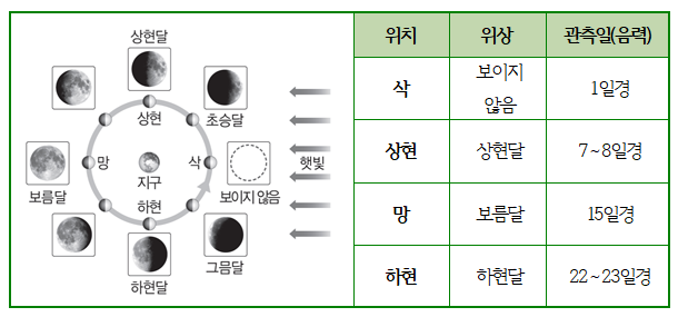 2. 달의 공전 위상 변화 (1) 달의 공전 : 달이 지구를 중심으로 약 한 달에 한 바퀴씩 서쪽에서 동쪽으로 도는 운동 (2) 달의 위상 : 지구에서 볼 때 햇빛을 반사하여 밝게 보이는 달의 모양 (3) 위상 변화의 순서 : 보이지 않는 → 초승달 → 상현월 →