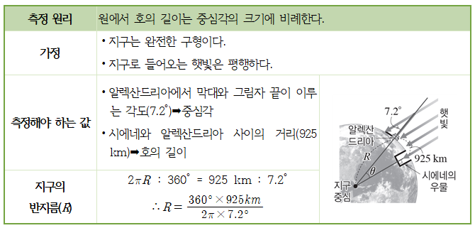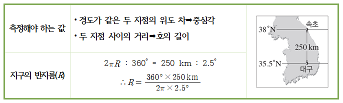 (2) 위도차를 이용한 지구 크기 측정 : 경도가 같은 두 지점의 위도 차는 중심각 크기와 같기 때문에 이를 이용하여 비례식을 세워서 구한다.