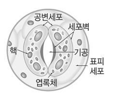 2. 증산작용 식물체 안의 물이 수증기로 변하여 잎의 기공을 통해 공기중으로 빠지는 현상 (1) 기공과 공변세포 ① 기공: 잎의 표피에 있는 작은 구멍으로 공변세포 2개가 둘러싸고 있으며 주로 잎의 뒷면에 분포한다. ∨ 기체가 출입하는 통로 역할 ② 공변세포 : 표피세포와 달리 엽록체가 있으며 안쪽 세포벽이 바깥쪽 세포벽보다 두껍다.