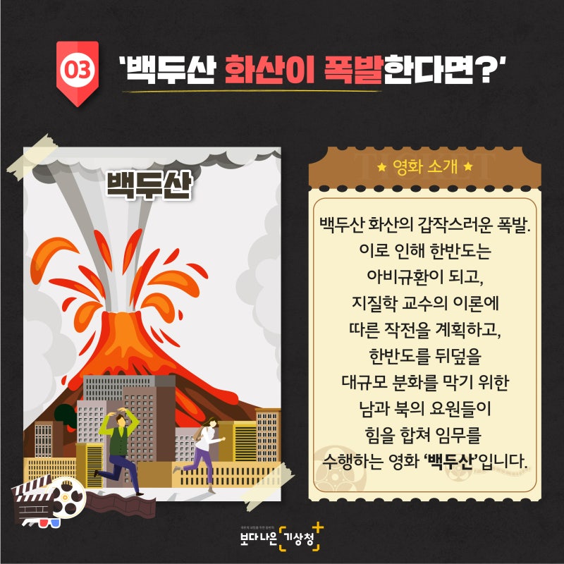 출처=기상청 2019년 12월 개봉한 영화 ‘백두산’은 한반도에서 가장 높은 산(높이 2,744m)이자 최대 규모의 폭발을 일으킨 백두산이 폭발하면서 일어나는 내용을 다룬 영화입니다.