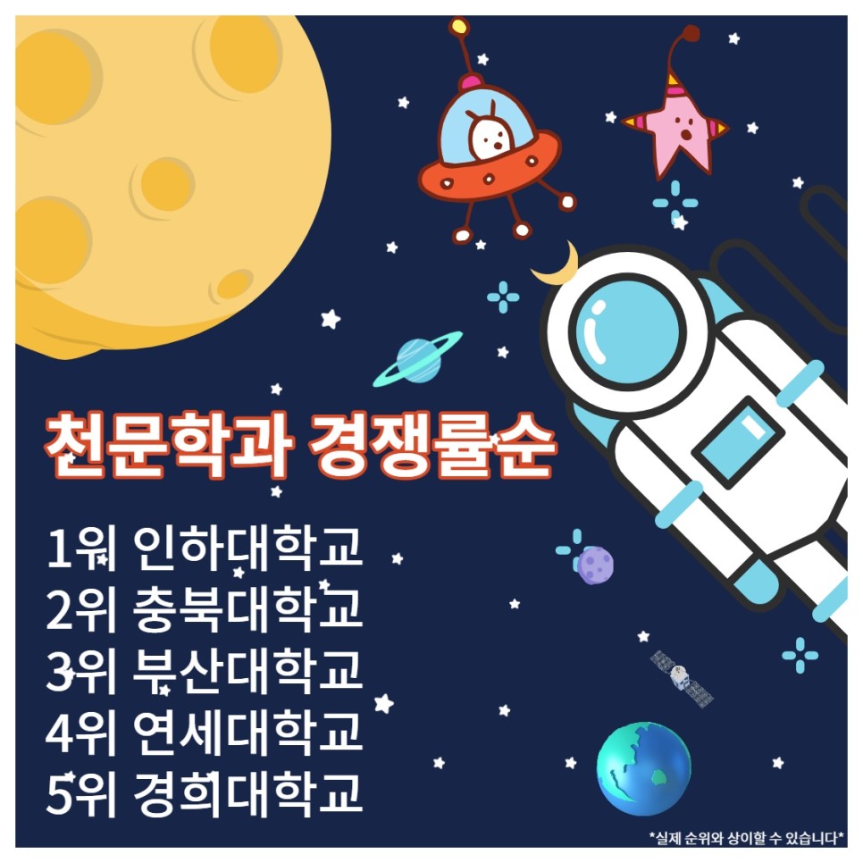 천문학과 경쟁률 순위 1위 인하대학교 2위 충북대학교 3위 부산대학교 4위 연세대학교 5위 경희대학교