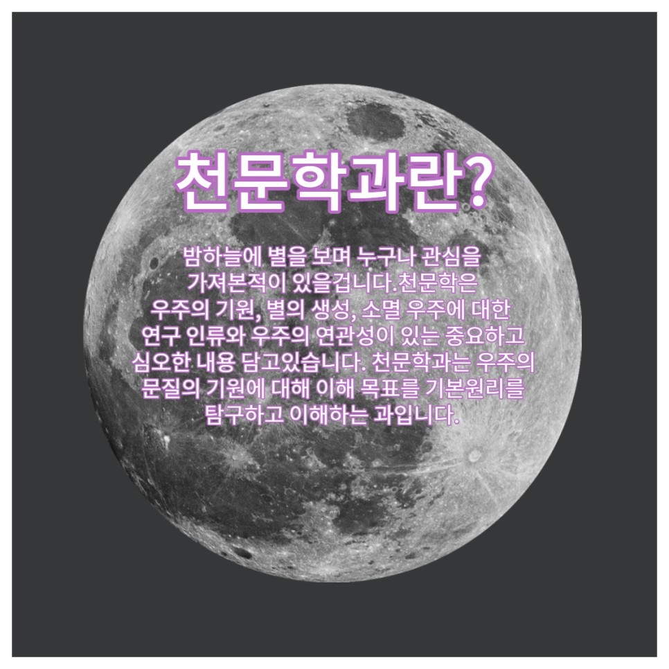 천문학과란?밤하늘에별을보면서누구나관심을가진적이있겠죠.천문학은 우주의 기원, 별의 생성, 소멸 우주에 대한 연구 인류와 우주의 연관성이 있는 중요하고 심오한 애용을 포함하고 있습니다.천문학과는 우주 물질의 기원에 대해 이해와 목표를 기본 원리로 탐구하고 이해하는 과입니다.