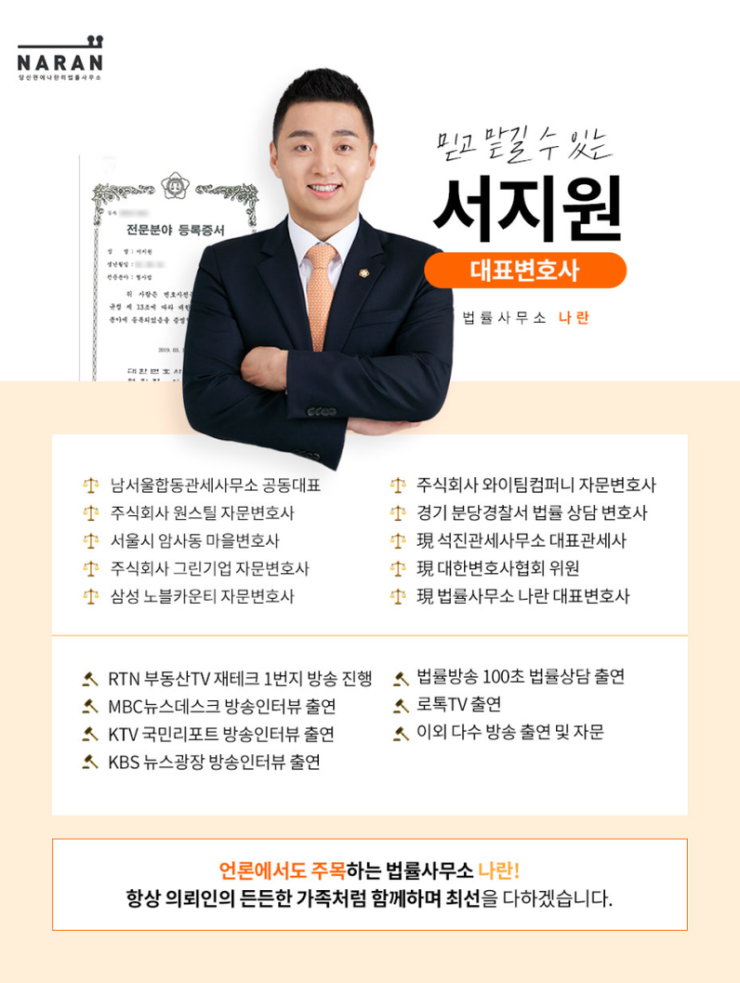 남서울합동관세사무소 공동대표주식회사 원스틸자문변호사 경기도 분당경찰서 법률상담변호사 삼성노블카운티자문변호사 등 다양한 이력을 통해 실력을 입증한 서지원 대표변호사는 MBC, KTV, KBS 등 공중파 출연을 통해 입지를 굳히게 되었습니다.