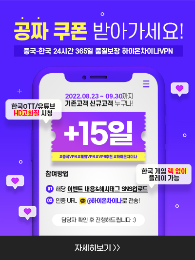 다만 업체마다 제공하는 서비스가 달라 무료 VPN 업체도 많은데 그 중에서도 속도나 품질이 보장되는 VPN 서비스를 이용해야 합니다. 무료 VPN 업체의 경우 속도가 느린 것은 물론 개인정보 유출 위험도 존재합니다.하이온차이나VPN은 국제전용회선 직결망으로 서비스를 제공하고 있습니다. 기업이 사용하는 프리미엄급 전용회선과 같은 회선이라고 생각하시면 됩니다. 일반 공중망 인터넷을 사용하여 끊김, 접속 장애 현상이 빈번한 타사 회선과 차별점이 있습니다.특히 중국의 경우 인터넷 검열이 심해서 유료 VPN에서도 서비스가 차단되는 업체가 많다고 합니다. 이러한 경우 사용자는 비용을 지불하더라도 서버가 복구될 때까지 서비스를 이용할 수 없는 경우가 종종 있습니다. 하이온차이나는 중국 대표 유선사업자인 CN2, CU와 협업해 국제전용회선으로 연결해 차단에 대한 걱정이 없습니다.중국에서 한국 넷플릭스나 유튜브 등 HD급 이상 고화질로 영상 콘텐츠를 이용하거나 한국 온라인 게임을 즐기고 있는 분이라면 하이온차이나를 추천할 수밖에 없습니다.또한 중국-한국 국가간 최단구간(다이렉트)으로 연결되어 365일 언제든지 양호한 속도와 인터넷 품질을 보장하고 있습니다. 특히 핑그로스 없이 해외에서 한국 게임이나 OTT 서비스에 접속해 플레이하거나 콘텐츠를 감상하는 데 도움이 됩니다.아래에 해당하는 분들께 저는 하이온차이나를 추천하고 싶습니다. 한국넷플릭스, 게임, 유튜브, 구글, 카카오톡, 기타 SNS 등 모든 한국 콘텐츠와 차단된 사이트를 이용하고 싶으신 분아래에 해당하는 분들께 저는 하이온차이나를 추천하고 싶습니다. 한국넷플릭스, 게임, 유튜브, 구글, 카카오톡, 기타 SNS 등 모든 한국 콘텐츠와 차단된 사이트를 이용하고 싶으신 분위에서도 언급했지만 영상의 경우 HD 고화질로 시청할 수 있고 문제 발생 시 24시간 온라인 문의가 가능합니다. 해외에서 사용하고 있는 서비스인데 속도나 문제가 생겼을 때 대처하는 것이 좋다고 느낍니다.현재 하이온차이나에서 2023년 1월 31일까지 행사를 진행하고 있습니다. SNS 인증을 하면 15일 추가, 그리고 친구나 지인을 추천하면 10일 무료 체험이 가능한데 자세한 내용은 아래와 같습니다. SNS인증 이벤트 이미지 캡처 –> 해시태그(#한국vpn #해외vpn #vpn추천 #하이IP) 추가 –>현재 활동하고 있는 본인 계정의 SNS나 블로그, 카페 등에 업로드 –>업로드한 내용을 카카오톡[@하이IP]에 URL로 인증친구소개 이벤트 기간 내 신규등록한 지인ID, 본인ID 카카오톡 [@하이아이피]로 전송중국 VPN, 차단없이 빠르게 – 하이온차이나 | 하이온넷㈜ 속도 5M/2M을 보장하는 국내 유일의 중국-한국 간 프리미엄급 중국 VPN 서비스 하이온차이나에서 한국 유튜브를 즐긴다!www.haiip.net중국에 장기간 여행을 가거나 유학 또는 거주하는 한국 분이라면 하이온차이나를 통해 안정적으로 내가 원하는 한국 콘텐츠를 보거나 게임을 플레이하는 것을 추천합니다. 또한 간단한 이벤트 참여로 ‘최대 25일까지 무료 서비스’를 받기를 바라며, 자세한 내용은 위 링크에서 확인하실 수 있습니다.중국에 장기간 여행을 가거나 유학 또는 거주하는 한국 분이라면 하이온차이나를 통해 안정적으로 내가 원하는 한국 콘텐츠를 보거나 게임을 플레이하는 것을 추천합니다. 또한 간단한 이벤트 참여로 ‘최대 25일까지 무료 서비스’를 받기를 바라며, 자세한 내용은 위 링크에서 확인하실 수 있습니다.