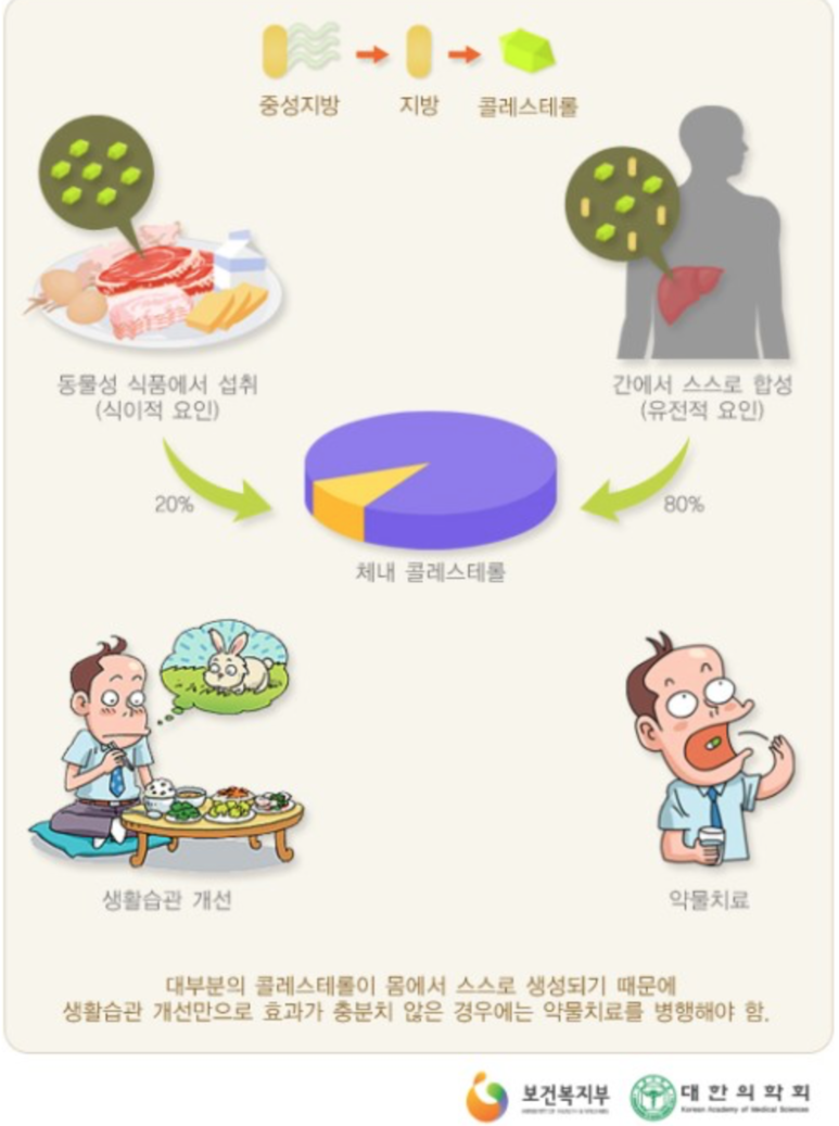 리의 몸에는 두 종류의 기름(지방)이 있다. 콜레스테롤과 중성지방이다. 콜레스테롤은 세포막의 구성성분 또는 호르몬이나 담낭즙의 원료가 된다. 자동차로 따지면 엔진오일. 차량이 나오지 않지는 않지만 딱딱하게 굳어 고장이 나 사고 위험에 처할 수 있다. 중성지방은 우리 몸의 중요한 에너지원이다 자동차로 치면 기름이다 기름이 떨어지면 차가 움직이지 않는다. 콜레스테롤은 아무리 많아도 우리 몸의 에너지원이 될 수 없고 중성지방은 세포막을 구성하거나 호르몬을 만들 수 없다.