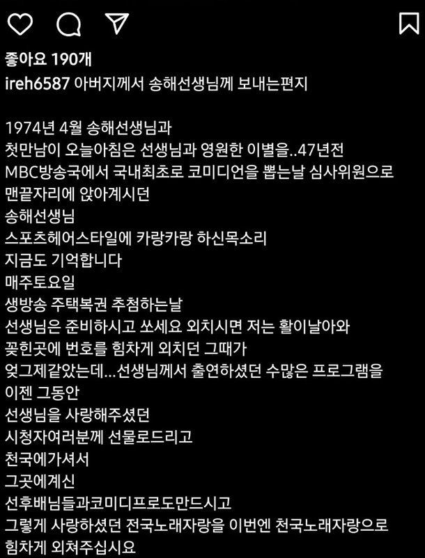 [마이데일리=강다윤 기자]국내 현역 최고령 MC 송해가 별세했다. 많은 이들의 사랑을 받은 국민MC가 별이 되자 동료 연예인들의 추모가 이어지고 있다.송가인은 8일 자신의 인스타그램을 통해 “가장 먼저 재능을 알아보고 이끌어주신 선생님. 잘 되고 나서도 진심으로 축하해주셨다. 감사한 마음을 잊지 않겠습니다. 좋은 곳으로 가서 푹 쉬세요라며 선혜를 추모했다. 송가인은 송해가 진행하던 KBS 1TV ‘전국노래자랑’에서 최우수상을 수상하며 트로트 가수로 데뷔했다.고교 재학 당시 전국노래자랑에 출연했던 트로트 가수 김수찬 역시 항상 잊지 않고 제 이름을 불러주신 송혜 선생님. 그동안 정말 감사했습니다. 사랑합니다라고 애도를 표했다.