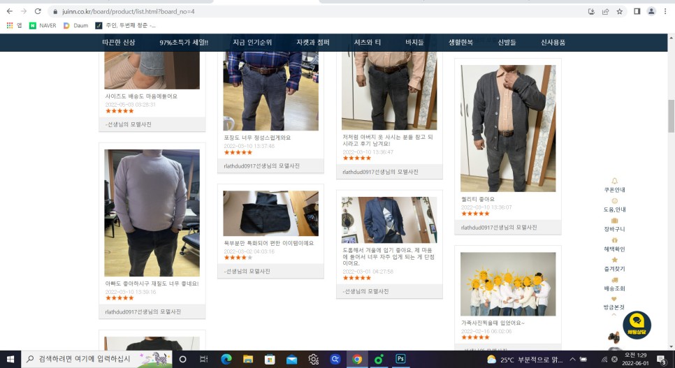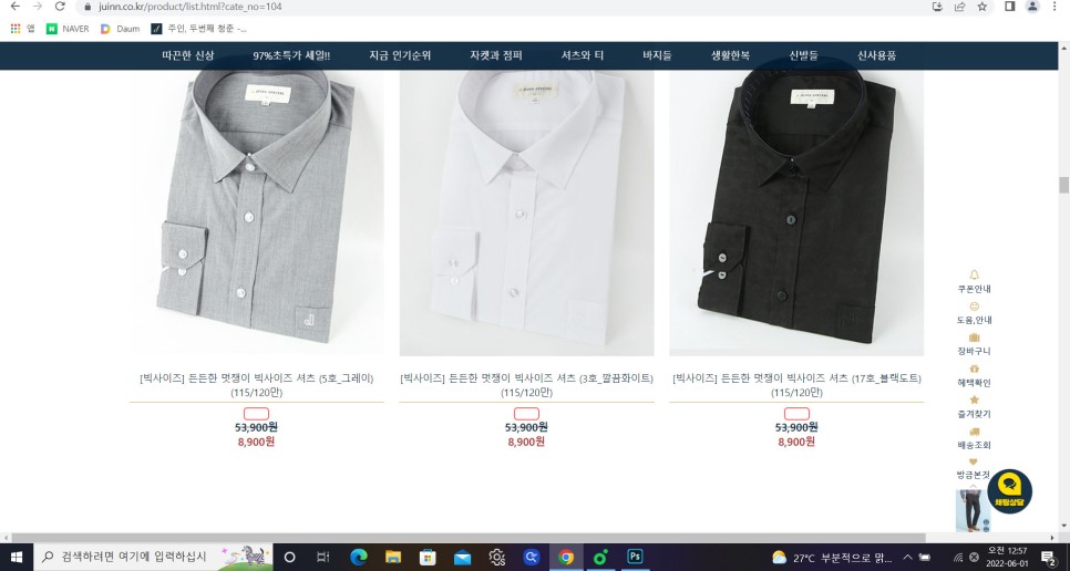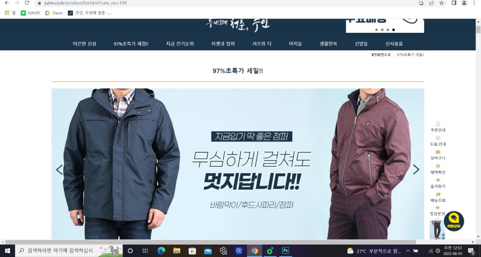 최근에 주문한 상품을 포스팅할 수 있어서 좋습니다.적어도 제가 제 돈으로 산 상품을 소개할 수 있기 때문입니다.살다 보면 정말 비싼 옷은 못 살 거예요.삶이 있어서 그런지 비싼 옷이라고 해도 재작년에 구입한 롱 코트, 그것도 아울렛에서 20만원 주고 산 패딩이 제가 가진 옷 중에 가장 비싼 옷입니다.위 사진처럼 97% 초특가세일이란 란이 있습니다.여기서 이번에 와이셔츠 두개랑 슬리퍼를 주문했어요.