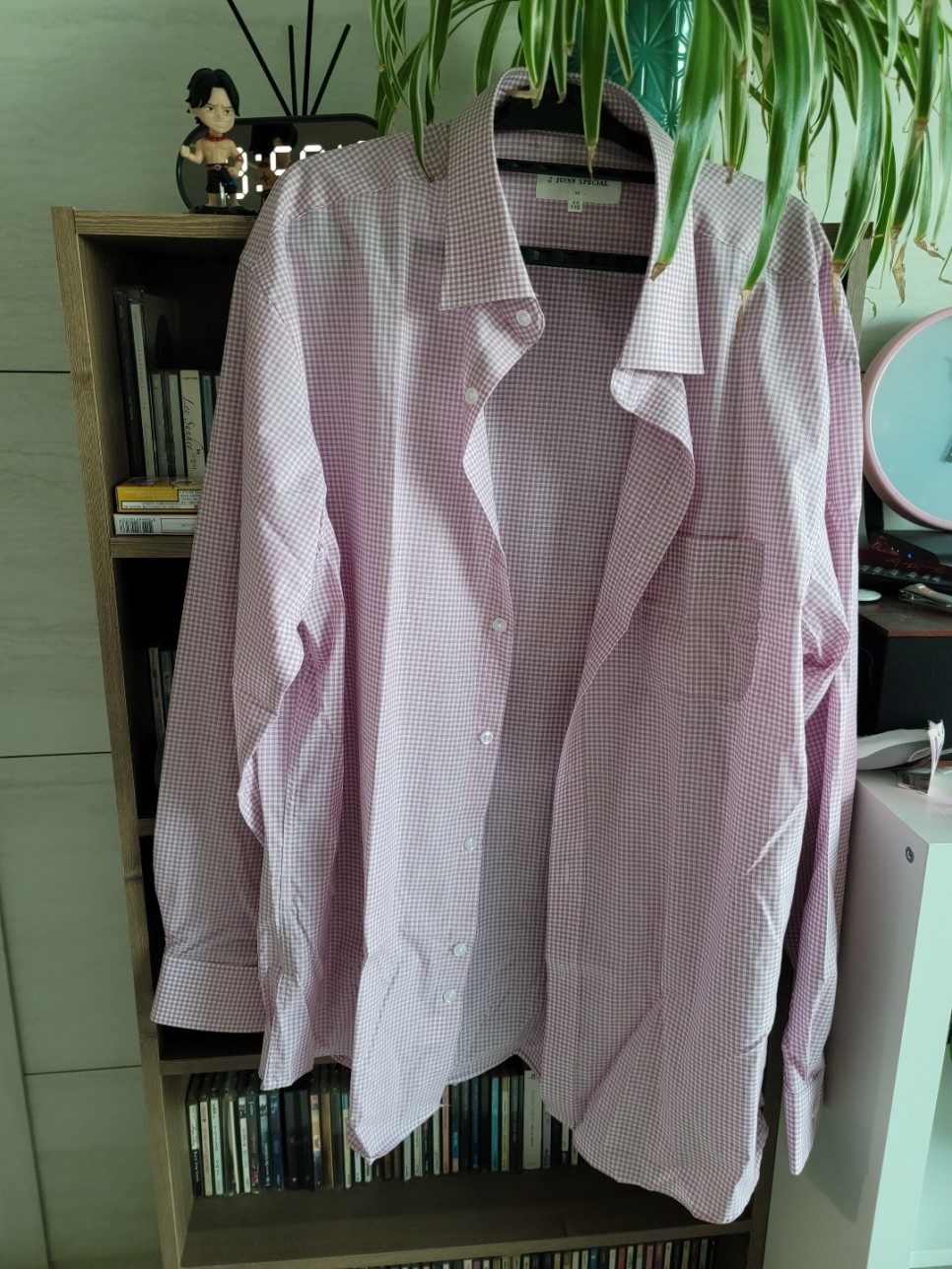 분홍색에 작은 체크무늬 와이셔츠입니다.여기에 남색 바지와 남색 가디건을 입고 외출했어요.몸이 안 예뻐서 입은 사진은 통과할게요.확실히 체크 무늬가 작은 것을 착용하면 큰 체크 무늬보다 젊어 보이는 효과가 있을 거예요.