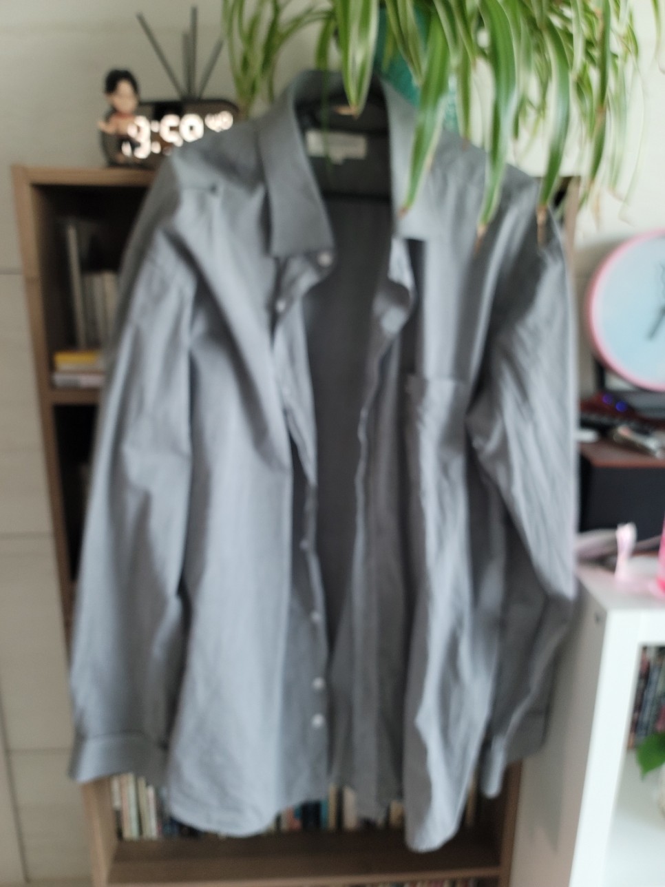 그레이 색상의 와이셔츠입니다.검은 바지와 베이지색 검정 가디건으로 코디하고 외출했습니다.예쁘니까 잘 어울린다고 들었어요.