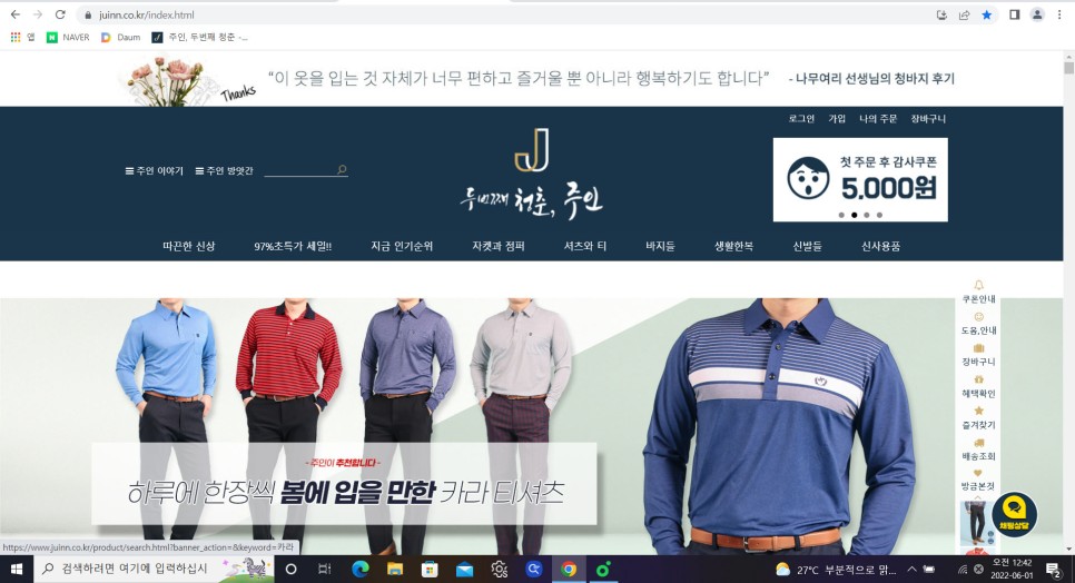 위 사진은 두번째 청춘남편의 대문입니다.사실 이 문을 보고 조금 실망했어요.아무리 중년 패션이라고 해도 언뜻 보기에는 너무 나이 든 사람들의 옷이 아닐까 하는 실망감에 그냥 나올까 했던 것도 사실이지만 다른 사이트에 아무리 찾아봐도 대부분의 중년 패션이 비슷했지만 일단 가격이 쌌습니다.몇 년 전에 처음 주문한 것은 와이셔츠였어요.일할 때 입을 만한 것을 주문했는데 흰색과 파란색 줄무늬였어요.그런데 다른 분이 제가 입고 있는 와이셔츠를 보고 비싼 거라고 생각했습니다.그때부터 옷을 주문하기 시작했어요.인증사진을 올려야 하는데 그때보다 제가 살이 쪄서 더 이상 입을 수가 없어서 재활용 상자에 들어갔어요.