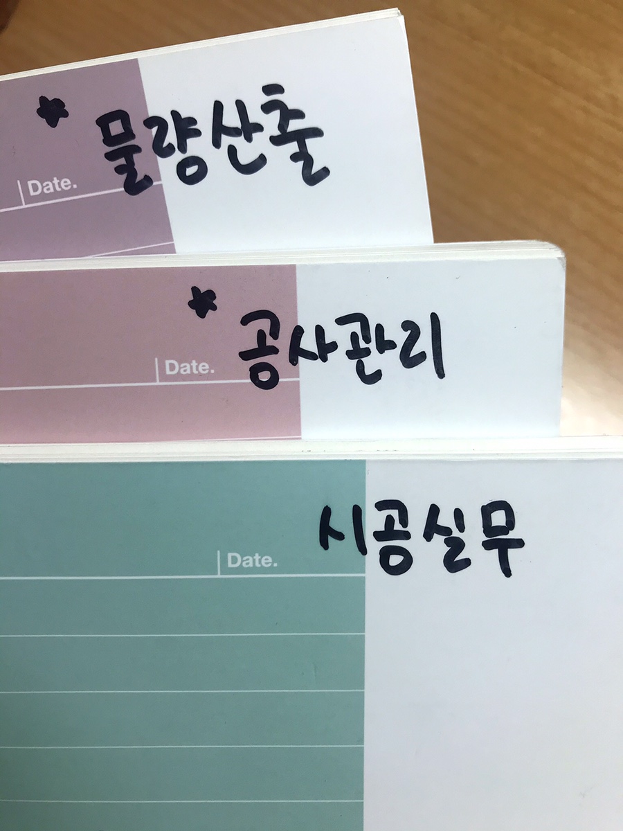 저는 공부할 때 시공실무공사 관리물량 산출 이렇게 3개의 파트로 분류해서 노트에 정리했습니다.