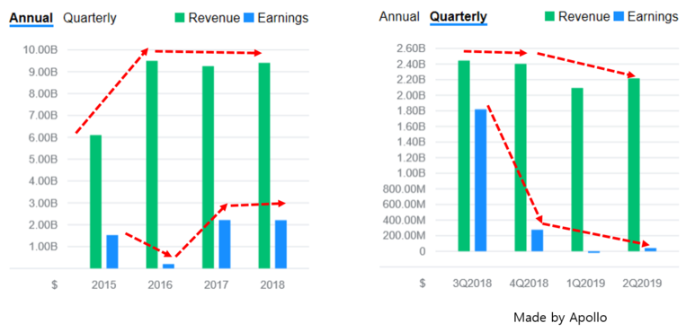 특히 2018년 3Q 이후 이익이 대폭 축소됐습니다.