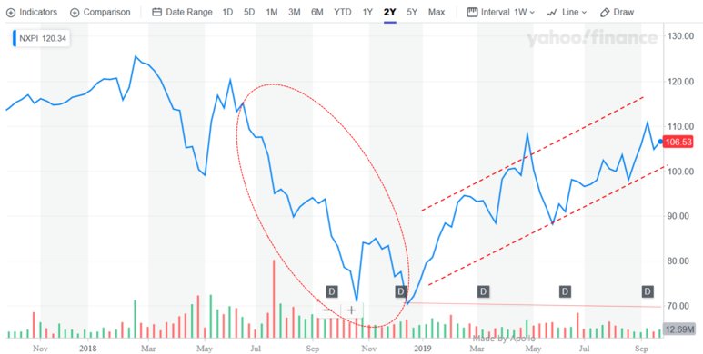 NXP 주가는 2018년 3Q 어닝쇼크 이후 주가는 급격히 떨어졌습니다.