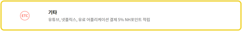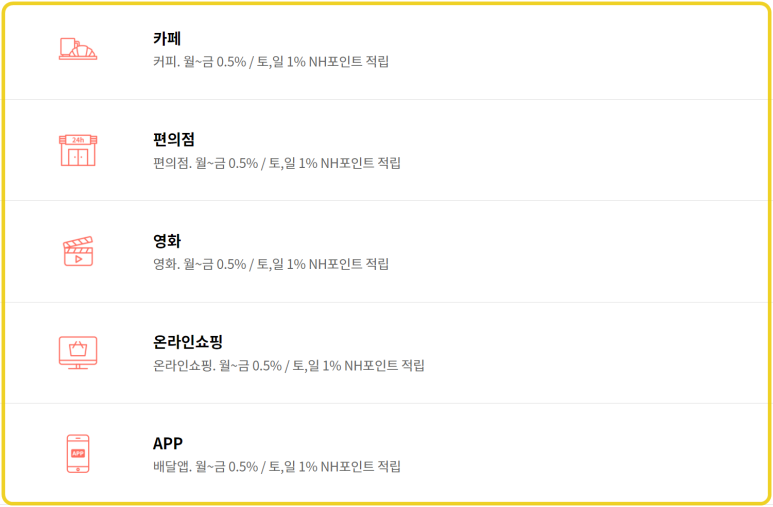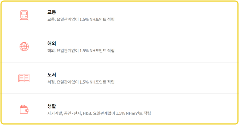 대중교통과 해외 이용금액, 자기계발처, 어학시험, 서점, 인터파크 티켓과 미용업종, 올리브영 등의 잡화까지.다양한 용도로 혜택을 제공하고 있습니다.위에서 본 평일과 주말의 혜택에 더해 이 체크카드는 팔방미인 같은 스펙을 가지고 있군요.NH포인트 적립에 중점을 두는 분들에게는 이만한 카드가 또 있을까 싶습니다.