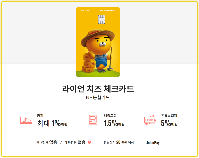 연회비는 없습니다. 혜택을 받기 위한 전월 실적은 20만원 이상입니다.귀여운 라이언 캐릭터와 함께 20대 분들이 이용하기 좋은 혜택으로 무장한 라이언 치즈 체크카드.