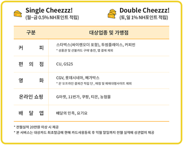 싱글치즈 0.5% (평일) / 더블치즈 1.0% (주말) 이렇게 적립됩니다.사용처는 위의 도표와 같이 커피전문점이나 편의점, 영화, 온라인 쇼핑몰, 배달앱입니다.주로 많이 이용되는 스타벅스, 영화배달의민족 등에서 소소한 포인트를 적립해주는 혜택입니다.