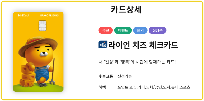 안녕하세요. 오늘은 생활 전반에 걸친 혜택을 제공하는 체크카드 농협라이언 치즈 체크카드에 대해 알아보겠습니다.