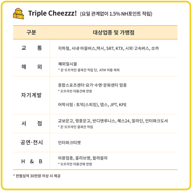위 혜택은 요일에 관계없이 1.5% NH포인트 적립 사용처입니다.↓↓↓