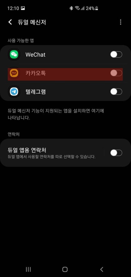 듀얼 메신저에서 사용 가능한 앱 부분에 있는 카카오톡을 활성화합니다.