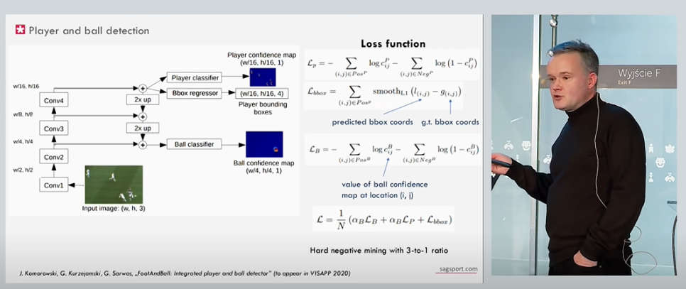 축구 영상 비디오를 분석하는 딥러닝 모델을 설명합니다. Foot And Ball 모델은 1920 * 1080 의 고해상도 이미지에 대하여 37 FPS 의 어느 정도 실시간 구동과 MAP 0.9 이상의 뛰어난 성능을 보이고 있습니다. 과거에는 축구 영상을 분석하기 위해 수작업으로 진행해 왔습니다. 예를 들어 직접 특정 선수가 공을 잡고 있는 순간을 찾아야 하고 매번 다른 경기마다 반복해야 하는 번거로움이 있었습니다. 그러나 상기 모델로 인해 이 작업을 자동화하여 처리할 수 있게 되었다는 것에 의의가 있습니다. 모델은 크게 Player Classifier와 위치 좌표를 담당하는 Bbox regressor, 그리고 Ball Classifier로 구성되어 있으며, Top-down process를 통해 Ball confidence를 높이는 데 주력한다고 합니다. 공의 위치는 축구라는 운동의 특성상 가장 중요한 정보이기 때문입니다. 아직도 숨어서 양손을 들거나 내리는 변형에 대해서는 영향을 받지만, 이는 보다 다양한 데이터 구축이나 전처리에 의해 개선될 수 있다고 합니다.