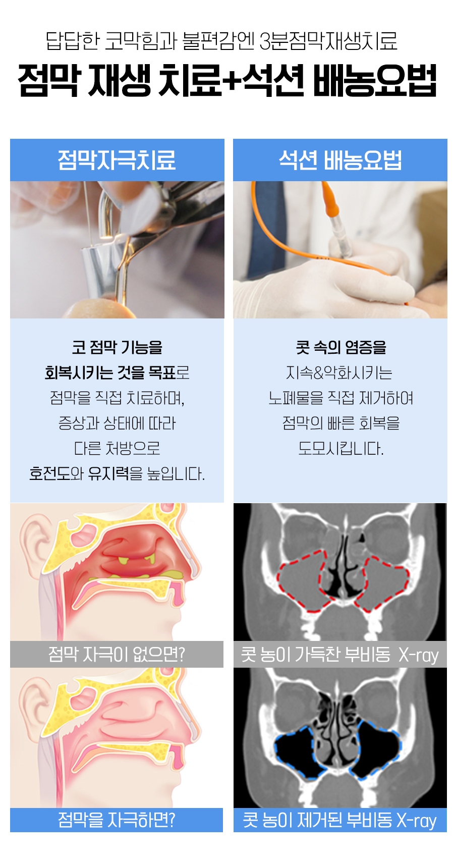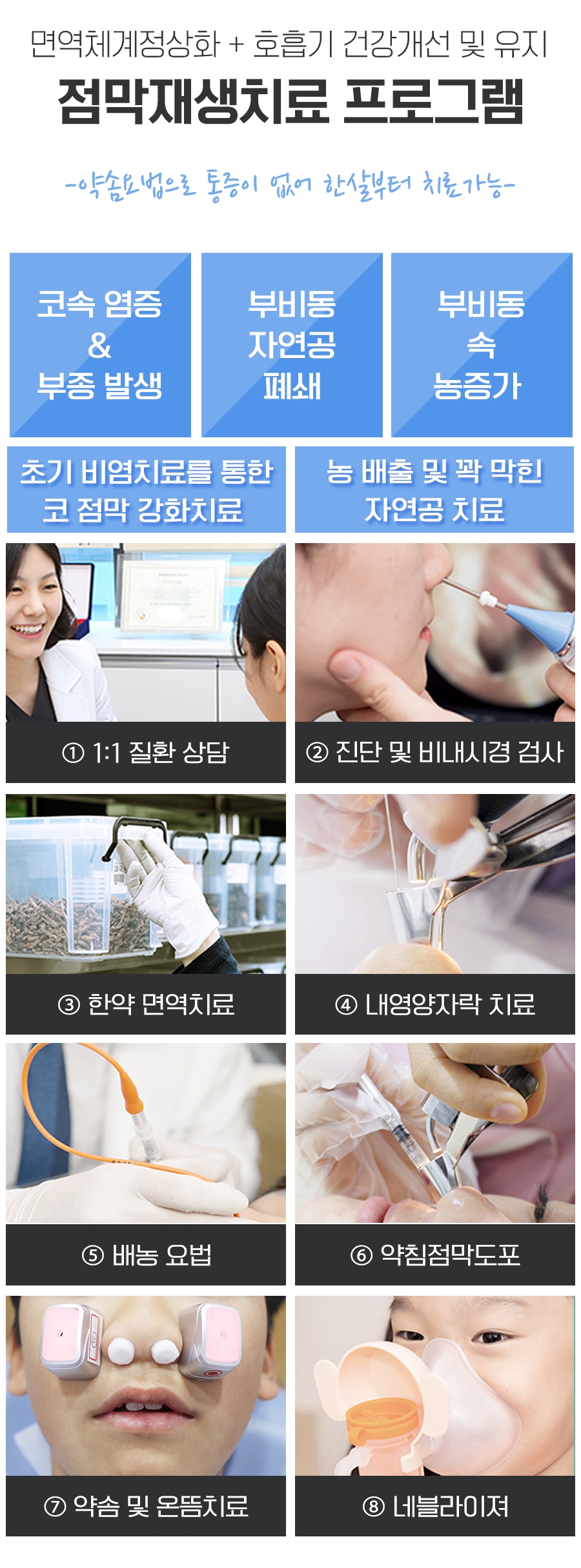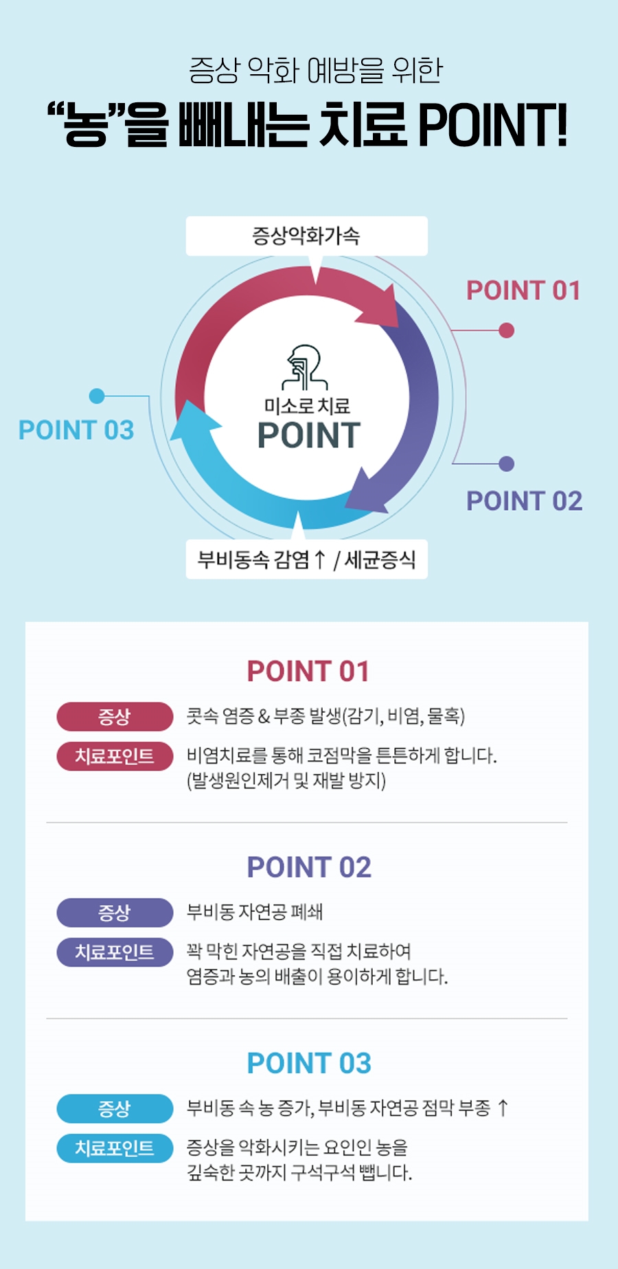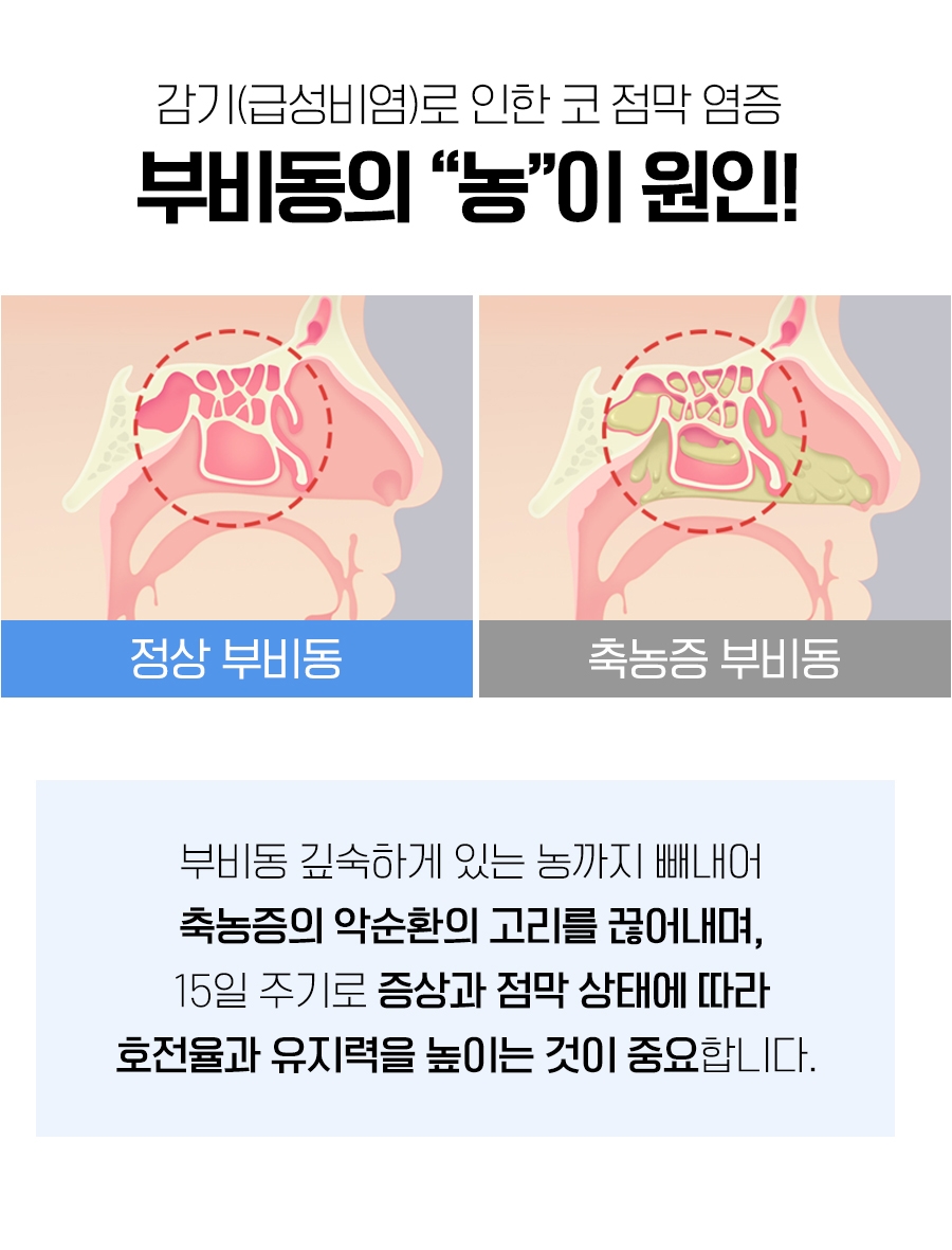 광명축농증병원에서는 부비강에 고여 있는 고름을 꺼내 축농증이 반복되는 악순환을 끊기 위해 증상과 점막 상태를 15일마다 파악하여 호전율과 유지력을 높일 수 있는 돌봄으로 적용하였습니다.