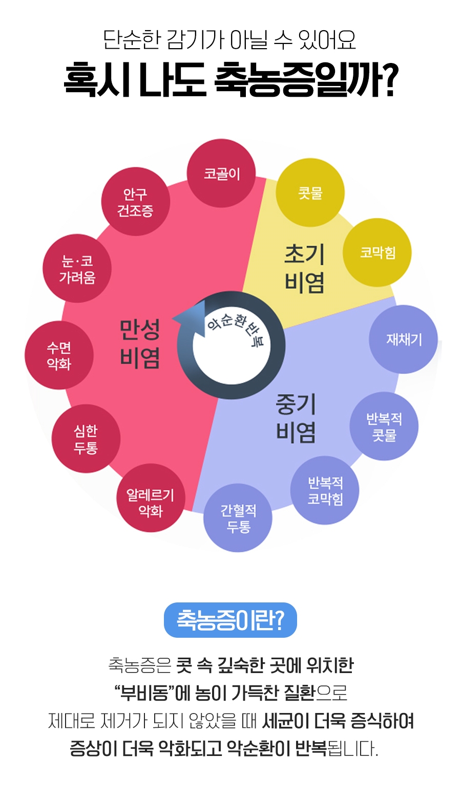 부비강염은 이런 부비강 공간에 부종이나 염증이 발생한 것을 가리켰습니다. 14일부터 21일 이내에 발생한 질병을 급성축농증이라고 하며, 3개월 이상 지속되는 질병의 경우는 만성축농증이라고 불렀습니다.