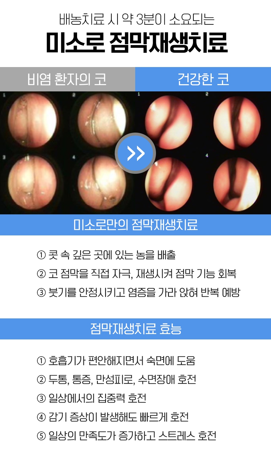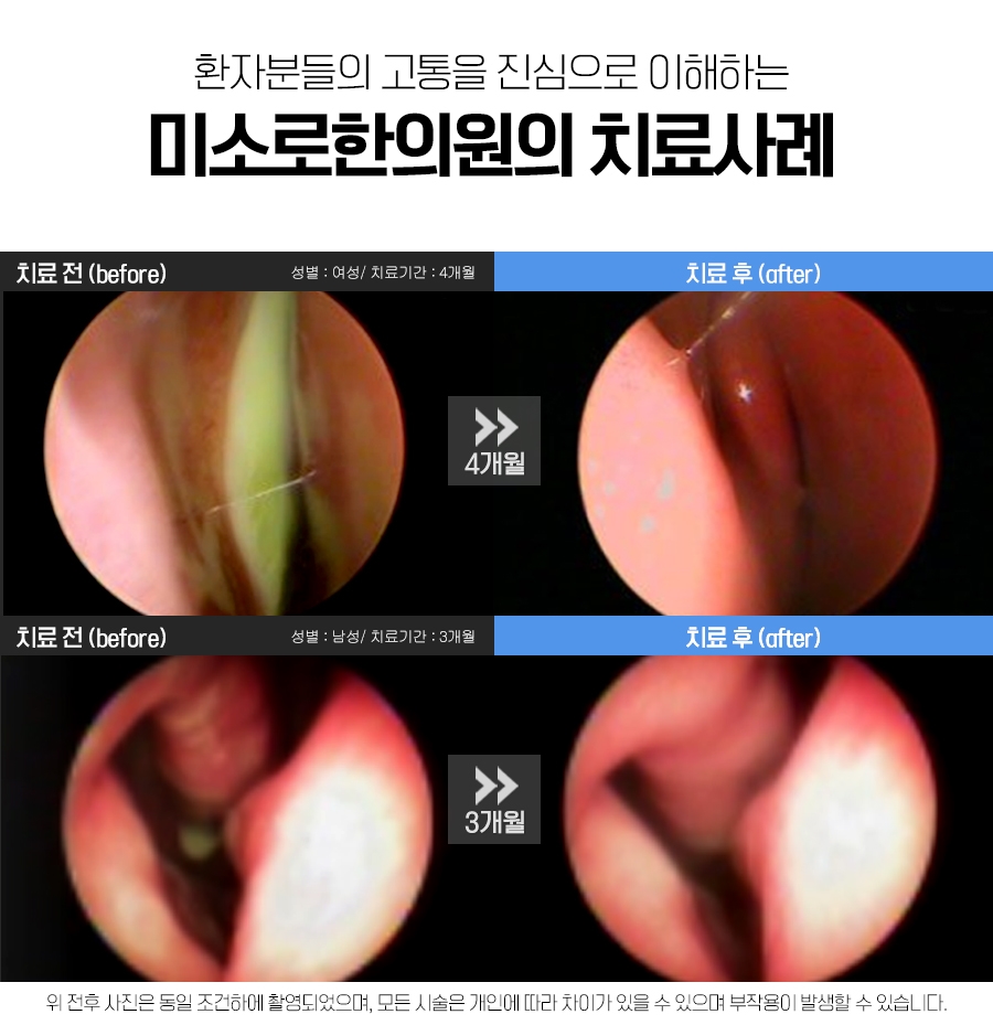 비강 내부의 붓기를 감소시킴으로써 호흡이 원활해지고 비폐색 증상도 완화할 수 있었습니다. 따라서 변화된 ph 농도로 섬모 조직의 기능이 정상화되면서 농도가 자연스럽게 배출되었습니다. 또한 산소가 원활하게 유입되어 신체 기능도 향상되었습니다.