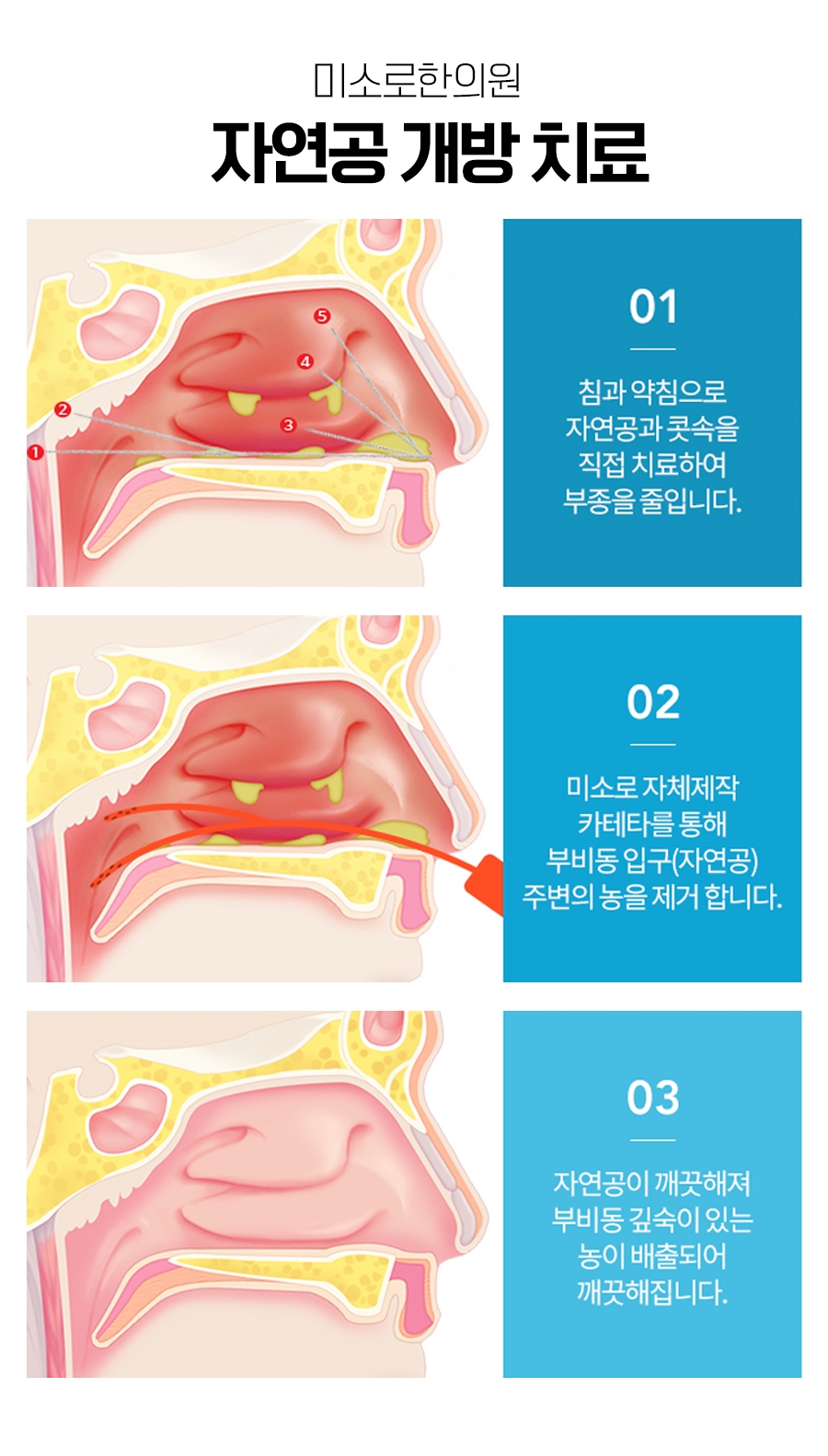 그러기 위해서는 자연공을 개방하는 치유를 적용해야 했습니다. 침과 약침을 통해 자연공과 콧속을 직접 치료하는 방법으로 부종을 감소시켰습니다. 해당 공간에 자체 제작한 카테터를 주입하여 부비동 입구 주변의 농도를 제거하였습니다.