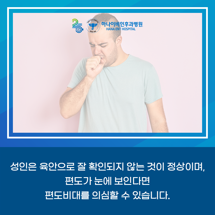 편도는 입에서 유입되는 공기 중에서 세균이나 바이러스 같은 유해물질을 걸러내는 1차 방어선 역할을 합니다 어린이의 경우 편도는 입을 크게 벌리면 육안으로 확인할 수 있습니다. 목젖 양쪽으로 튀어나온 부분입니다. 편도선은 만 5세 이후에 서서히 작아지기 시작하고 면역 기능도 다른 기관으로 옮겨갑니다. 따라서 성인은 육안으로 잘 확인할 수 없는 것이 정상으로 편도선이 눈에 보이면 편도선 비대를 의심할 수 있습니다.