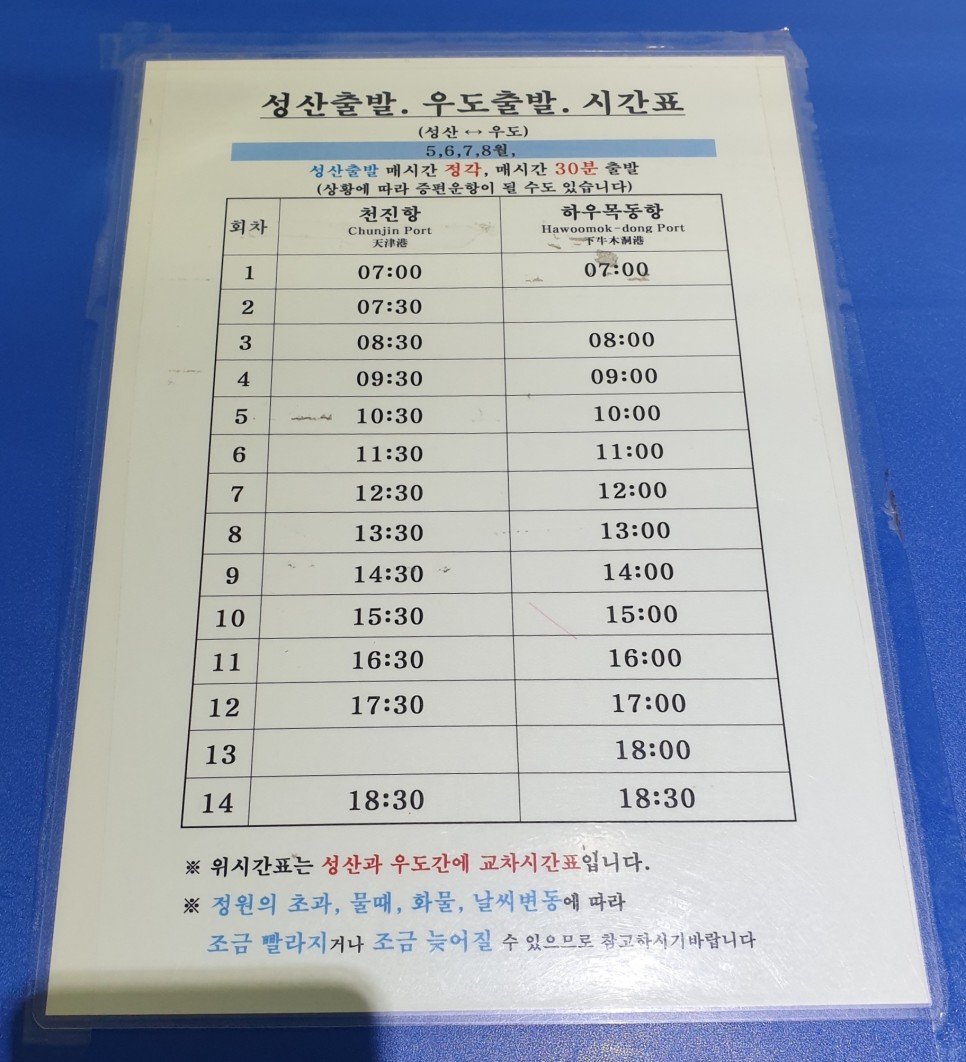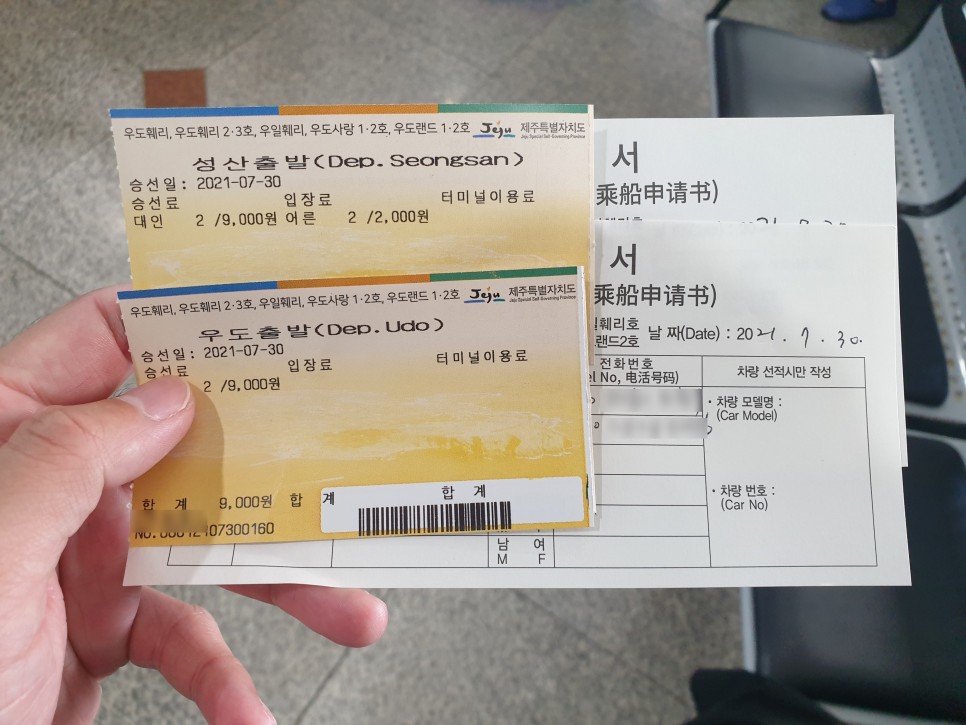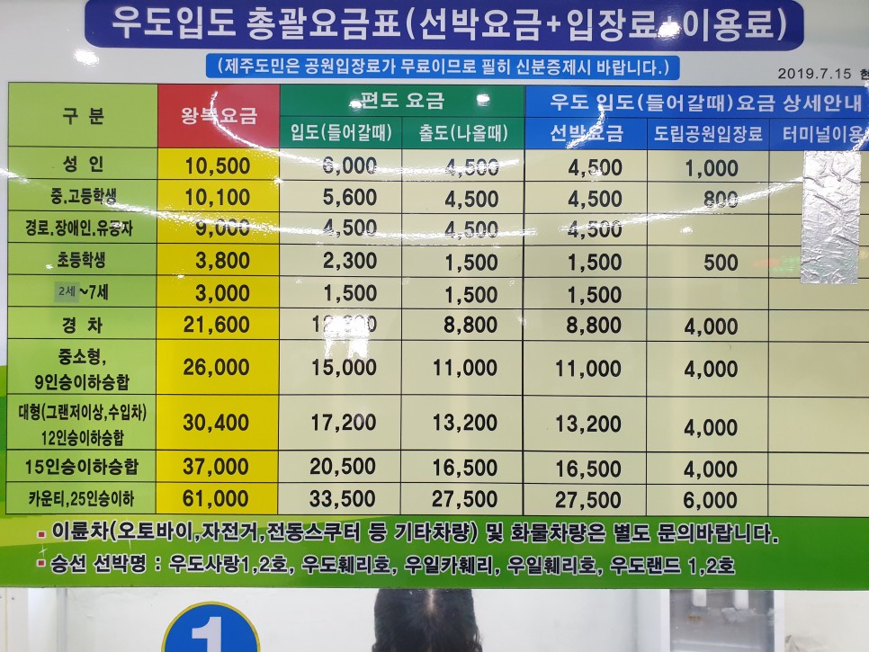 왕복 티켓을 사려면 승선신고서는 2장을 써야 한다.- 우도 입도가 가능한 차량 – 왕복으로 표를 사는 것이 편도로 사는 것보다 싸다.