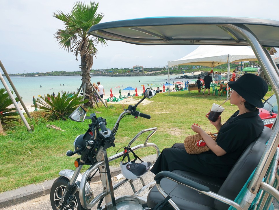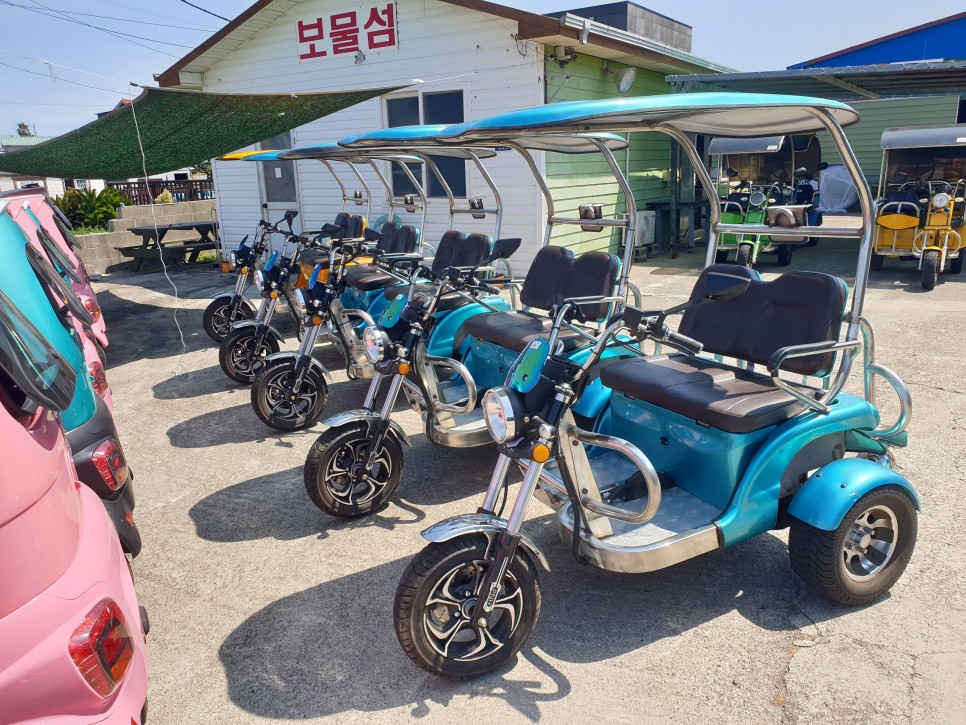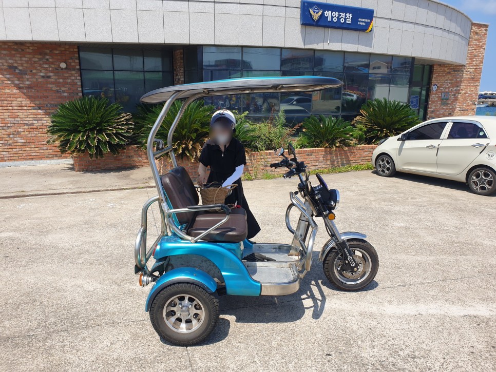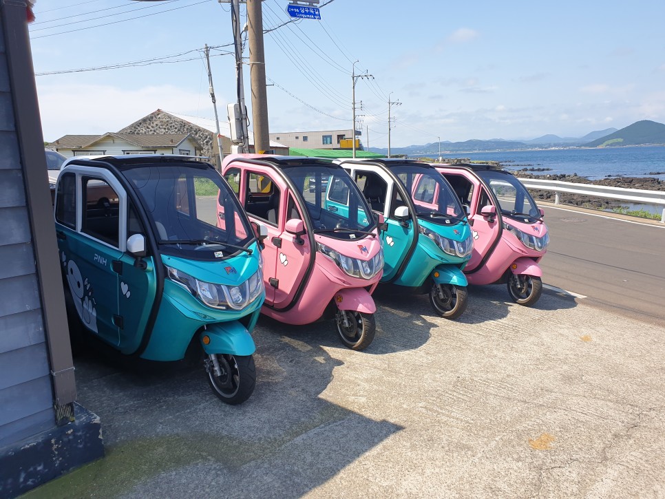 우리는 쌈트바이 전기차를 빌리기로 했어위의 선쉐이드가 반투명한 것이 구형이고 불투명한 것이 신형이라고 한다.-구형3시간(3만원)-신형3시간(3만5천원) 여자친구는 간지를 중요하게 생각하는 편이라 신형을 빌렸다. 3시간 정도면 우도를 돌 수 있다.