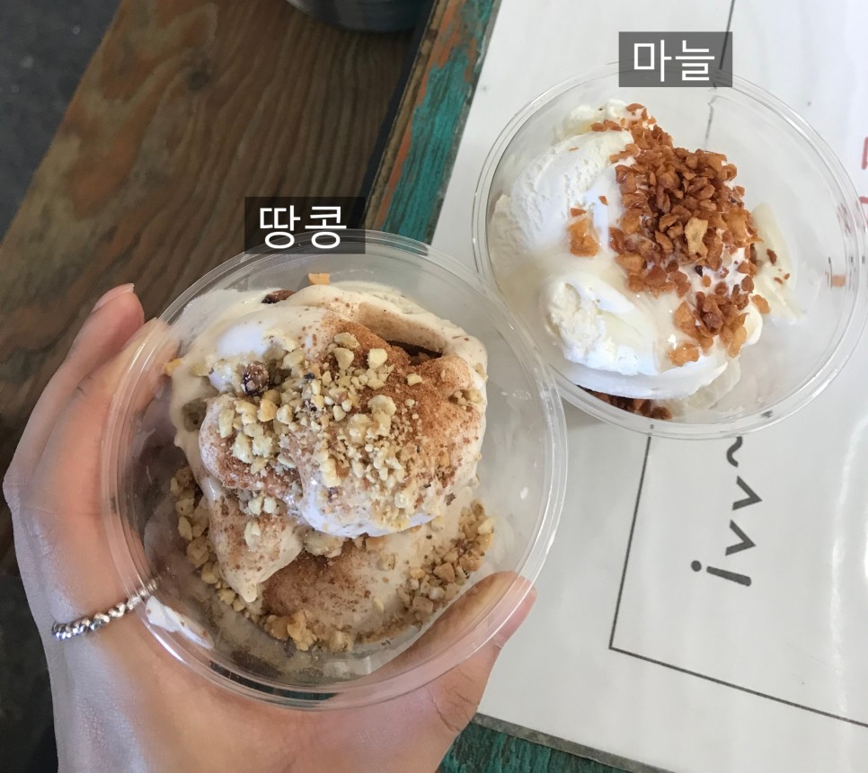 땅콩아이스크림은 아이스크림에서 땅콩맛이 약간 나고 땅콩과 계피가루?가 뿌려져 있다.마늘 아이스크림은 마늘 후레이크와 소프트 아이스크림 맛이 없지 않지만, 이것만은 끌리는 맛도 아니다. 그냥 여행 왔으니까 먹어볼게. 쿠쿠쿠