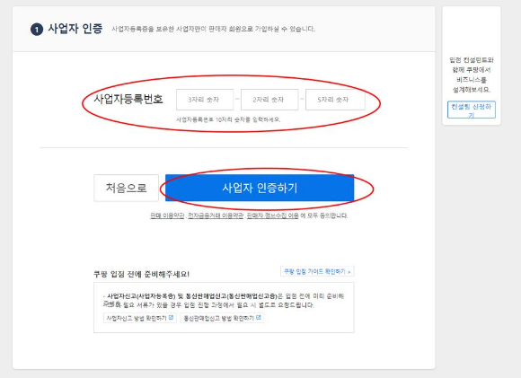 판매자 정보 입력에서 필요 정보를 입력한다.인증버튼으로 사업자등록증과 맞는 대표명인지 확인하고 사업자 주소와 상호 입력 및 통신판매업 신고를 한 경우 신고번호를 입력한다.입점 담당자명과 정산받을 계좌까지 입력ㄱㄱㄱ·기타 필요한 서류도 안내된게 있으면 입력하면 된다