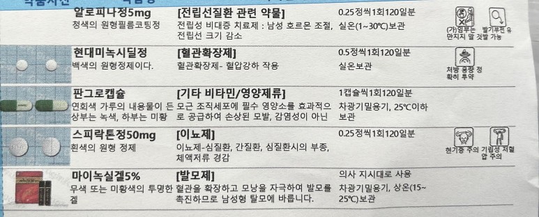 4. terms.naver.com 현대미녹시질 정현대약품에서 생산하는 미녹시질 5mg 제품으로 1일 조반량은 0.5T 2.5mg입니다. 이 약도 복약 지도서를 보면 혈관 확장제라고 나와 있습니다. 식약처의 허가는 고혈압 약이에요. 중증 고혈압 약이라고 생각해도 좋고, 탈모 치료로는 오프 라벨 처방입니다. 정식 허락한 것은 바르는 형태입니다. 탈모조합약을 처방할 때 병원마다 약용량을 조절하는데 이곳은 미녹시딜량을 절반으로 줄였습니다. 원래 클래식은 피나스테리드 5mg 1/4t, 미녹시딜천 5mg 1t, 스피로놀락톤 25mg 1t인데 비해 미녹시딜천과 스피로놀락톤은 요즘 하루 복용량을 조금 줄이는 편인 것 같아요. 효능효과, 부작용, 주의사항 등 더 많은 정보는 아래를 참고하시기 바랍니다.-성상 : 백색의 원형 정제다. – 제형 : 나정. 형 : 원형. – 색상 : 흰색. 식별표기 : MNT [성분정보]미녹시딜 5mg [보존방법]의 기밀용기, 실온보관 [효능효과]1. 증후군 또는 표적 장기 손상에 의한 고혈압 2. 이뇨제와 두 종류의 혈압 강하제를 병용하는 최대 용량에도 반응하지 않는 고혈압(불응성 고혈압) [용법 용량] 1. 성인(12세 이상): 미녹시딜로서 조회량에게 1일 1회 5개월을 경구 투여하고, 유지량으로 1일 10-40개월을 1~수회 분할 투여한다. 1일 최대 100개까지 투여할 수 있다. 2 terms.naver.com 을 판 그에게 캡슐 한올바이오펌으로 생산하는 판토카 복사약 입니다. 케오모블, 판시딜, 보르두민, 마이녹실S, 모발렌 등과 같은 약이라고 생각해도 좋습니다. 성분은 약용효모 100mg, 케라틴 20mg, 티아민질산염 60mg, p-아미노안식향산 20mg, 판토텐산카르슘 60mg으로 탈모보조치료에 사용됩니다. 설명서에 나와있는 용량은 1일 2~3알인데 여기서는 1일 1알만 먹으라고 되어있네요.스피락톤천대원의 제약으로 인해 생산하는 스피로노락톤 50mg 제품으로 1일 용량은 0.25t 용량은 12.5mg입니다. 위액운 고혈압, 원발성 알도스테론증, 조칼륨혈증, 각종 부종 등의 치료에 사용되며, 탈모 치료에서는 오프라벨입니다. 스피로노락톤은 이뇨제나 혈압약이지만 강력한 한앤드로겐 효과가 있어 남성형 탈모 치료에도 처방이 많아지고 있습니다. 용법 용량 및 부작용에 대한 내용은 아래를 참고하십시오.https://terms.naver.com/entry.naver?docId=2136794&cid=51000&categoryId=51000 [외형정보] ·성상:흰색원형정제·제형:나정·형:원형·색상:흰색·분할선:-·식별표기:(앞)DWP, (뒤)분할선[성분정보] 스피로놀락톤 50mg [보존방법]의 기밀용기 [효능효과]고혈압(본태성, 신성 등), 원발성 알도스테론증, 조칼륜혈증, 심성부종(울혈성 심부전), 신성부종, 간성부종, 특발성부종[용법용량]성인: 스피로노락톤으로 1일 50-100개를 분할 경구 투여한다. 이뇨제로 투여할 때는 다른 이뇨제와 병용하는 것이 좋으며 이 약의 투여를 중지할 경우에는 2~3일간 간다.terms.naver.com 마이녹실겔 5% 현대약품에서 생산하는 미녹시딜 5%겔(젤)형 제품입니다. 남성형탈모(앤드로젠탈모) 치료 승인이 났습니다. 액상은 많이 아시겠지만 액상은 발라서 잘 흐르는 걸로 봐서 그 부분을 보완한 제품이라고 보면 됩니다. 외영엑입니다 용법 용량은 다음과 같습니다.1)모발과 두피를 완전히 말린 뒤 이 약 0.51g을 하루 2회(아침, 저녁) 최소 4개월간 환부만 바른다.2)1일 총 투여량이 2g을 초과하지 않는다.