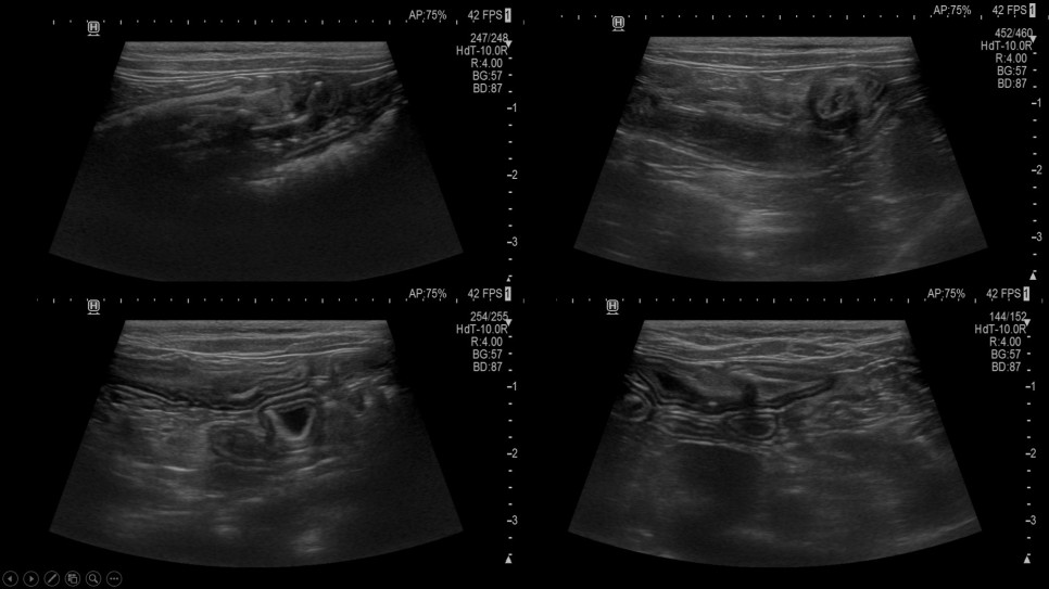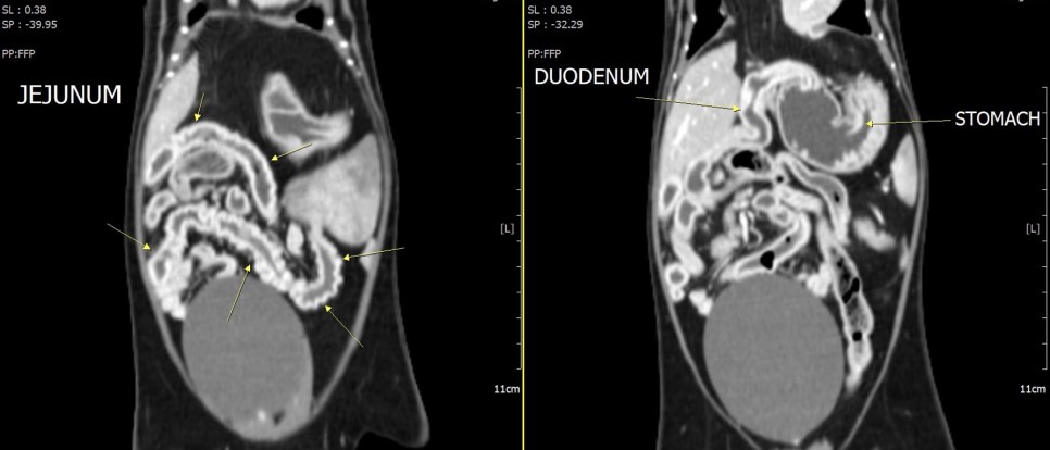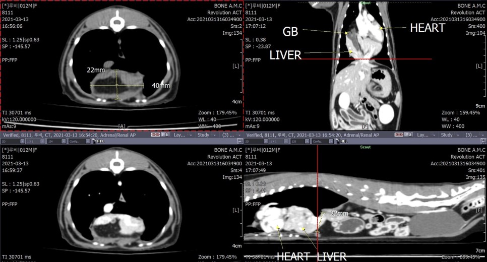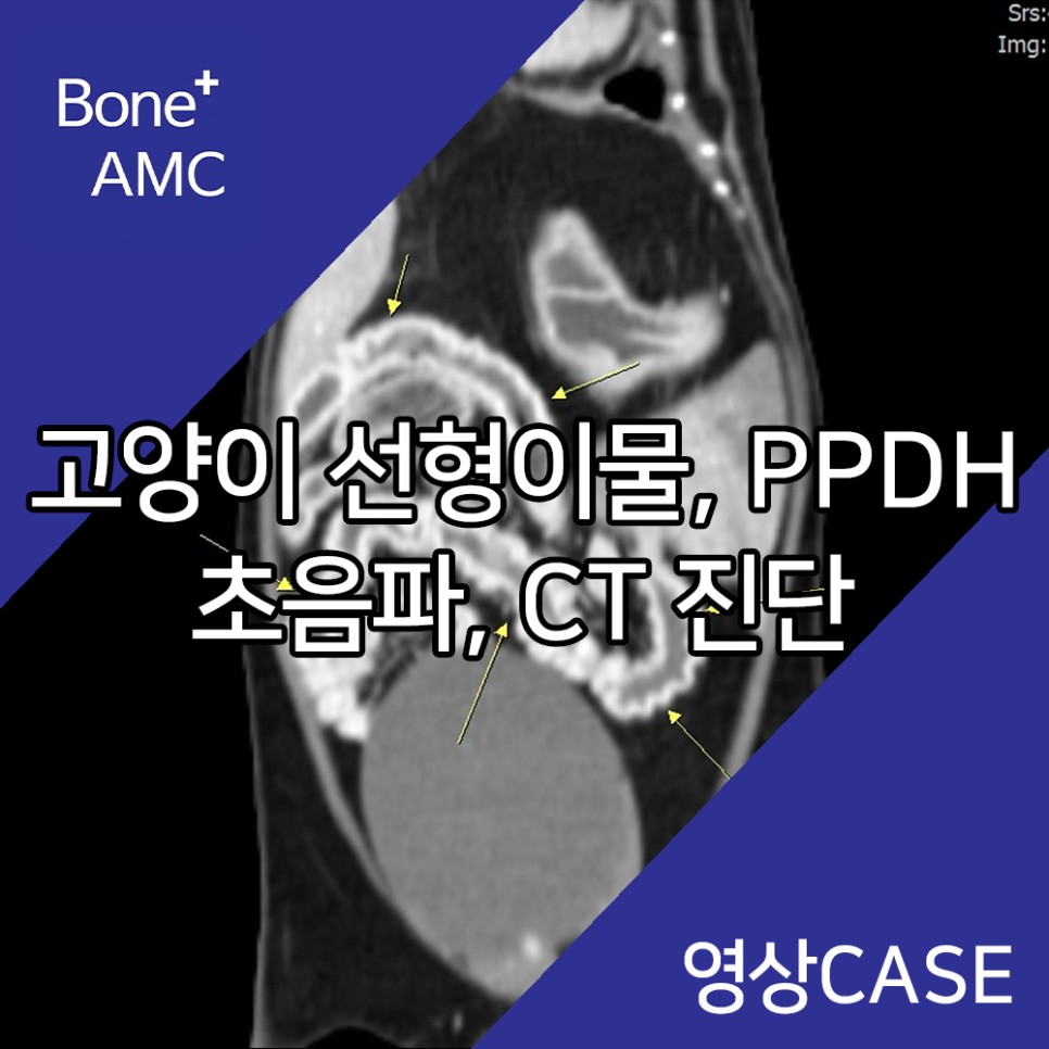 초음파 검사 결과 횡격막 탈장과 함께 소장 내 선형 이물질이 광범위하게 확인되었으며, 이로 인한 장폐색 소견이 동반되고 있는 것으로 확인되었습니다.구토의 직접적인 원인은 선형 이물질에 의한 장폐색이라고 판단되었으나, 횡격막 탈장에 대한 교정도 필요한 상태라고 판단되어 수술 계획을 위한 CT 검사를 실시했습니다.CT