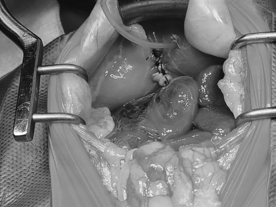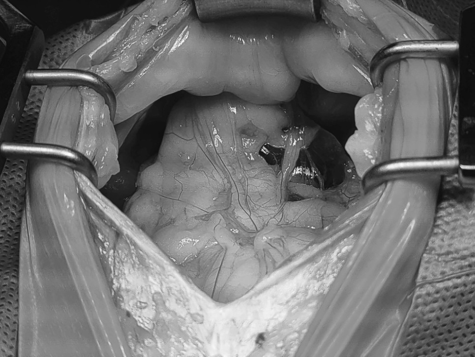 먼저 횡격막의 탈장 부위를 확인하고, 탈장이 된 복강 장기를 원위치로 돌려 횡격막 결손부를 복구했습니다.