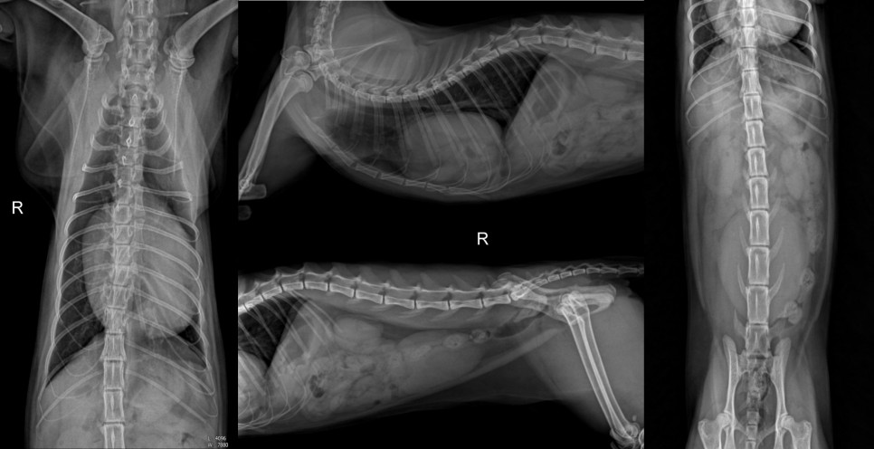 주요 증상으로 내원하기 전날부터 급격한 식욕저하와 반복적인 구토 증세로 타원하여 횡격막 탈장이 의심된다는 소식을 듣고 정밀검사와 수술을 위해 본원에 내원하였습니다. X-ray