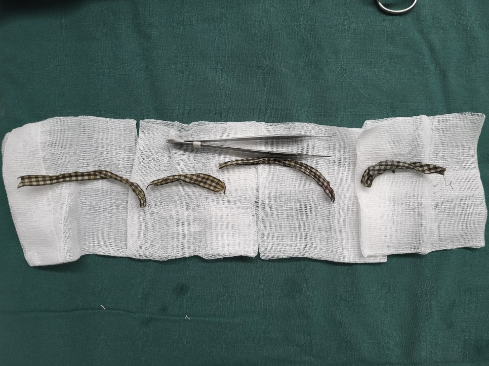 선형 이물질에 의해 창자가 꼬여있는 것을 확인하고 나서 패브릭 선형 이물질을 제거했습니다.