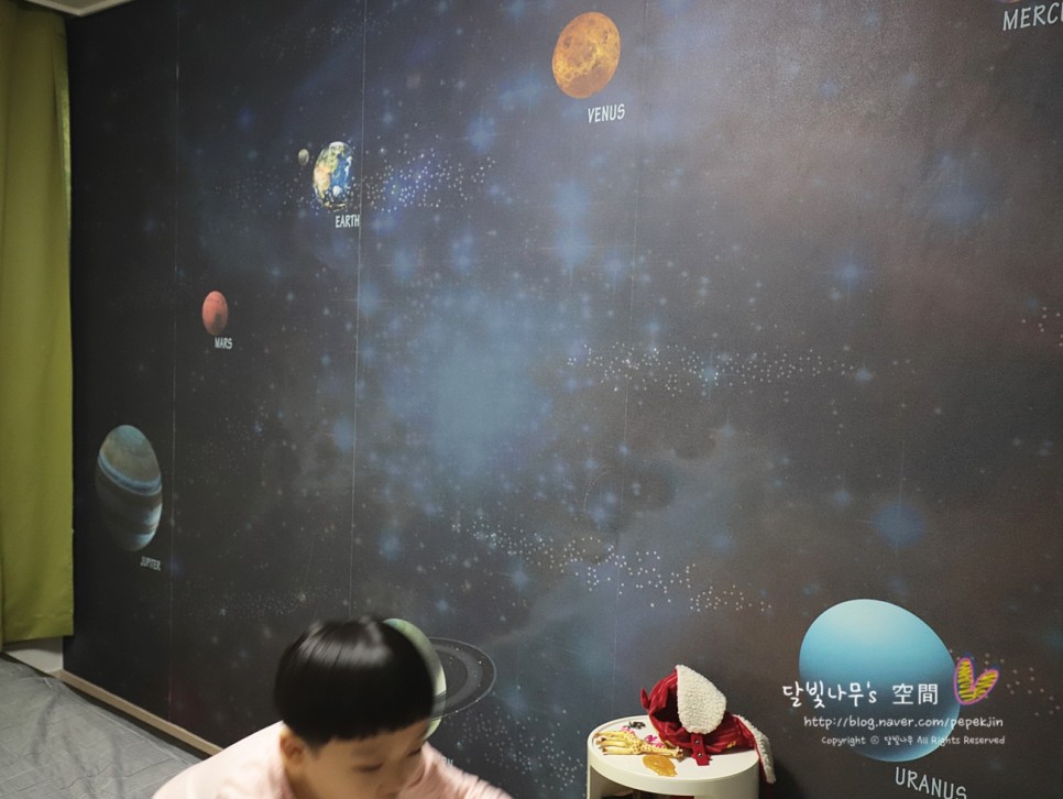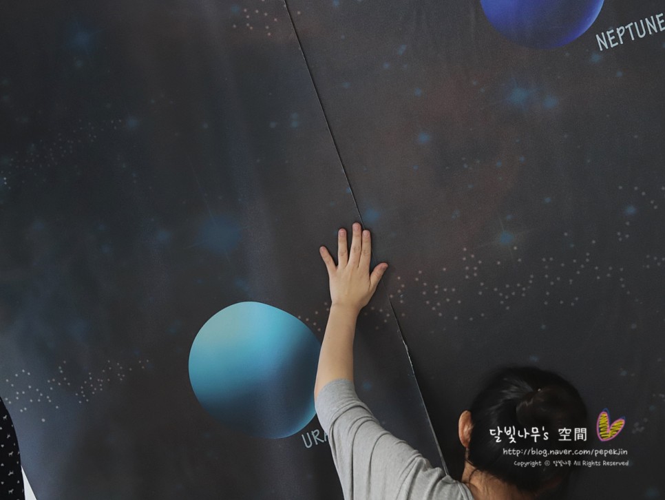 대신 일찌감치 과학자를 꿈꾸는 조카를 위해 아이방 벽지를 태양계가 수놓아져 있는 벽지로 선택했습니다!