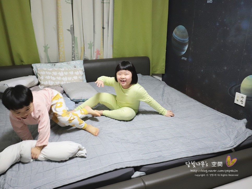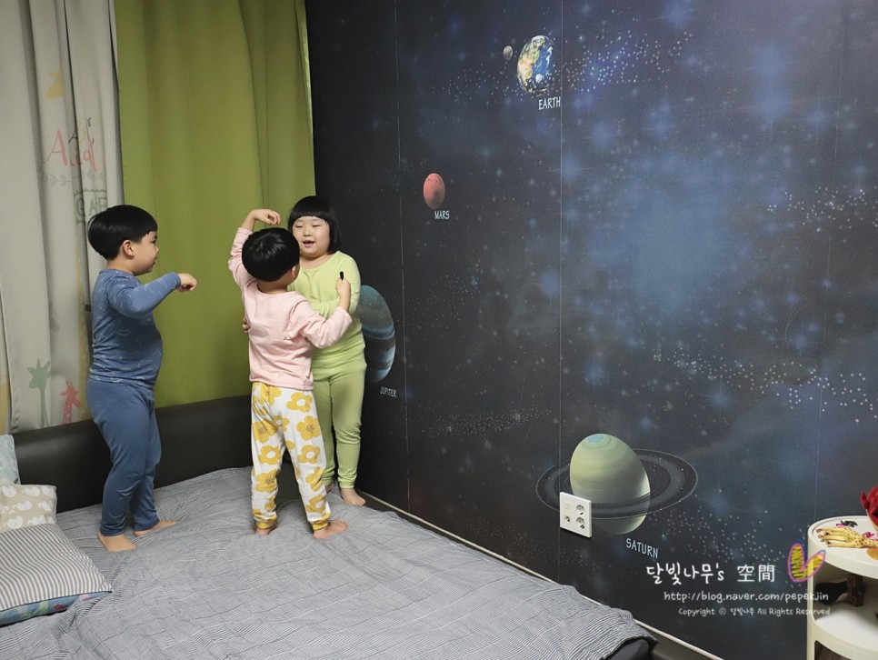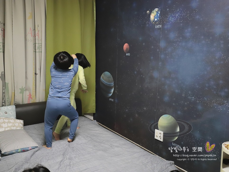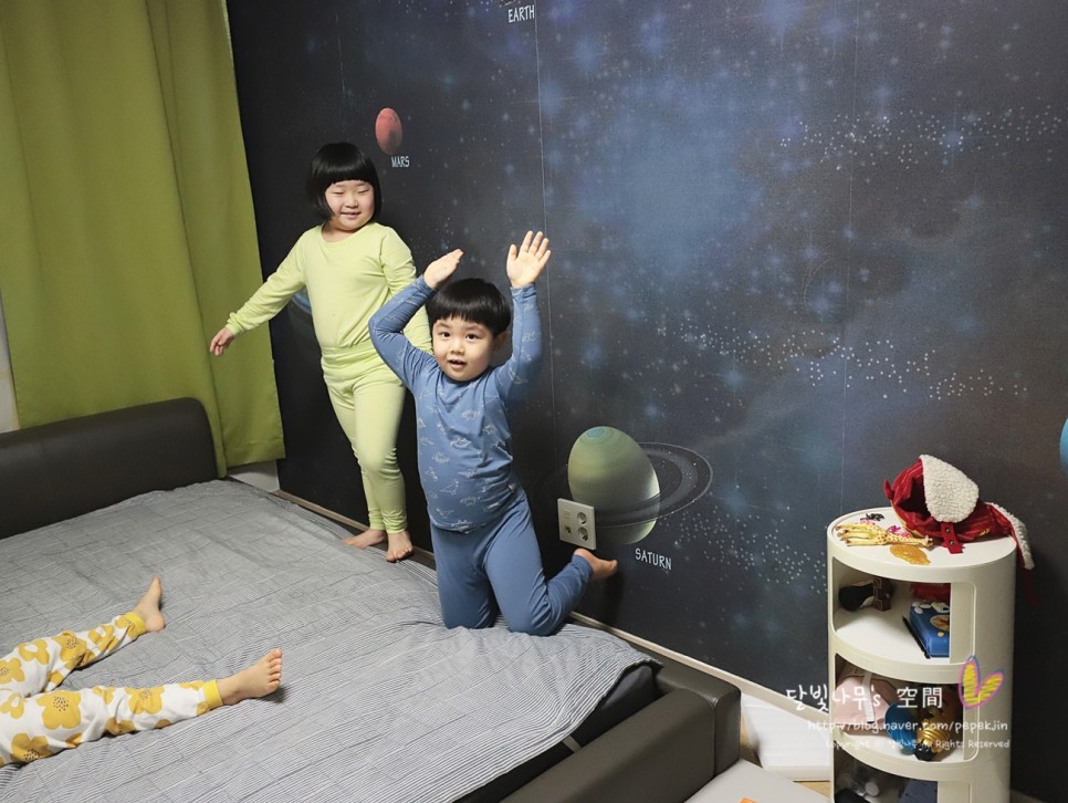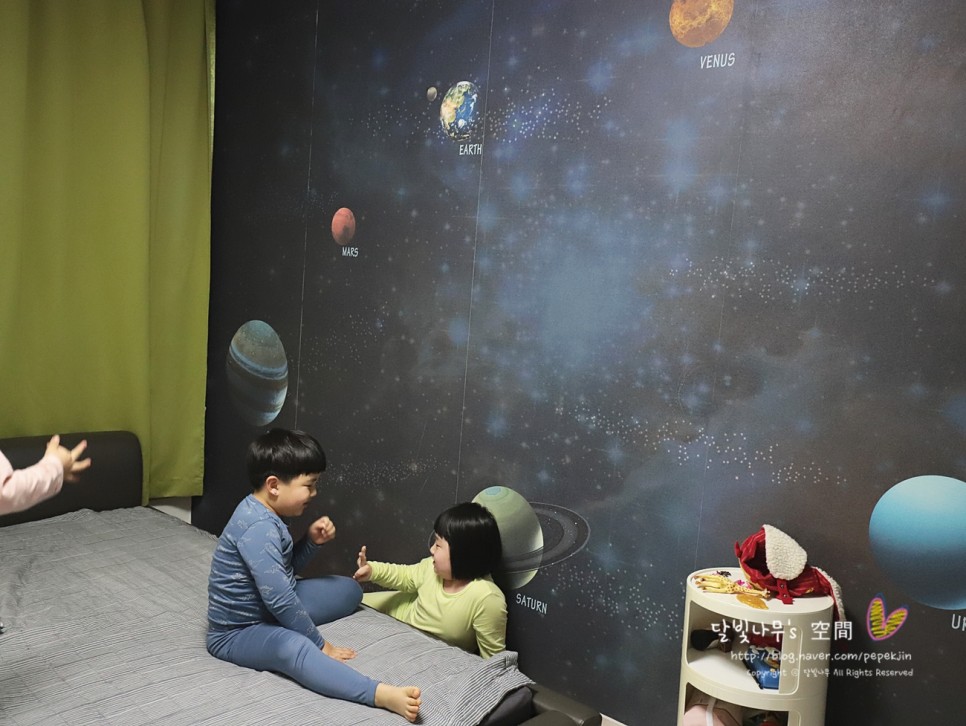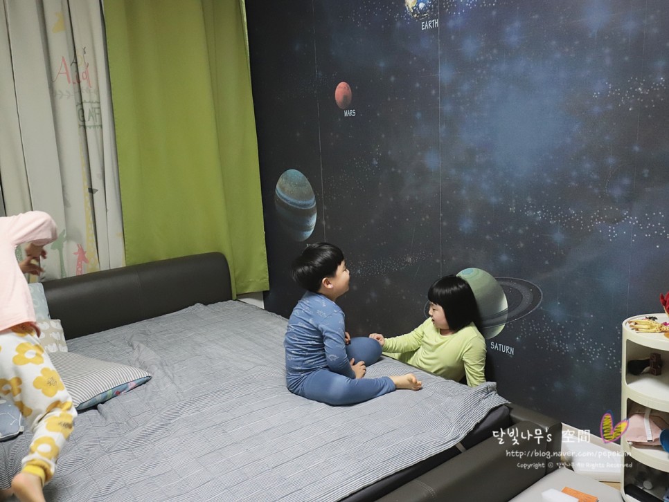 새로운 느낌의 방에 가 보기 전에 우리 남매는 우주가 펼쳐질 줄 알고 전날 밤에 잠이 들어 계속 조카 방을 얘기하다가 잠들었어요.