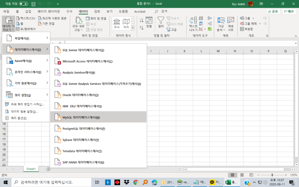 오피스 2016 이후 버전 데이터 > 데이터 가져오기 > 데이터베이스에서 > MySQL 데이터베이스에서 액세스하십시오.