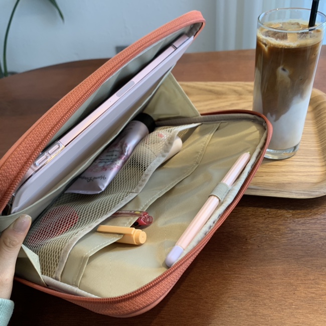 어쨌든 나의 아이패드 파우치 선택은 나의 니즈를 매우 만족시켜주는 제품이었다. 기본적으로 케이스를 씌운 아이패드 하나와 작은 수첩, 그리고 핸드크림, 펜, 애플 펜슬, 손거울 등을 넣고 아이패드 파우치를 가방처럼 사용할 수도 있는 매우 실용성이 좋은 제품.
