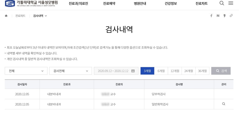 서울성모병원 홈페이지에서 회원가입 후 로그인하면 최근 3년치 피검사 결과 수치도