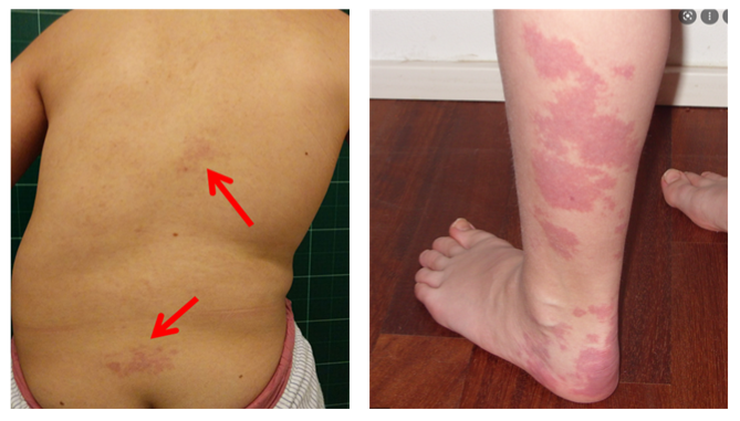 피부의 모세혈관 기형으로 인해 붉거나 보라색 반점이 생겨 출생 시 눈에 띄는 증상일 때가 많습니다. 보통 태어날 때부터 나타날 수 있으며 나이가 많아짐에 따라 반점은 얇아지거나 짙어질 수 있습니다.사진에서 보이는 화살표가 와인색 모반입니다.